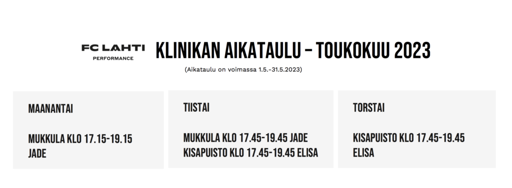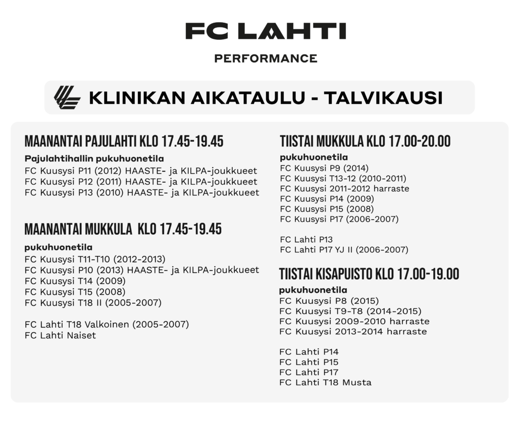 FC Lahti Performancen vetäjänä toimii Aleksi Marttiin, +358 40 6306630.
