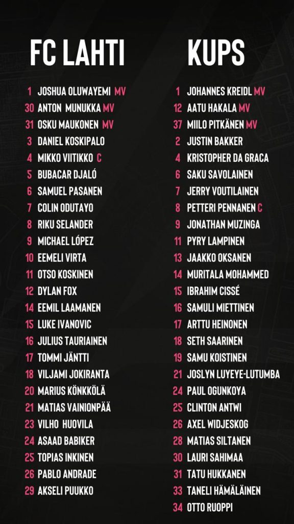 Illan ottelu on Lahdelle viikon sisään kolmas kilpailullinen ottelu. Sunnuntaina Lahti kierrätti vahvasti, joten keskiviikon otteluun on saatavilla tuoreita jalkoja. Toisaalta kokoonpanosta puuttuvat Bubacar Djalón, Topias Inkisen ja Daniel Koskipalon lisäksi pelikieltoiset Samuel Pasanen ja Riku Selander.