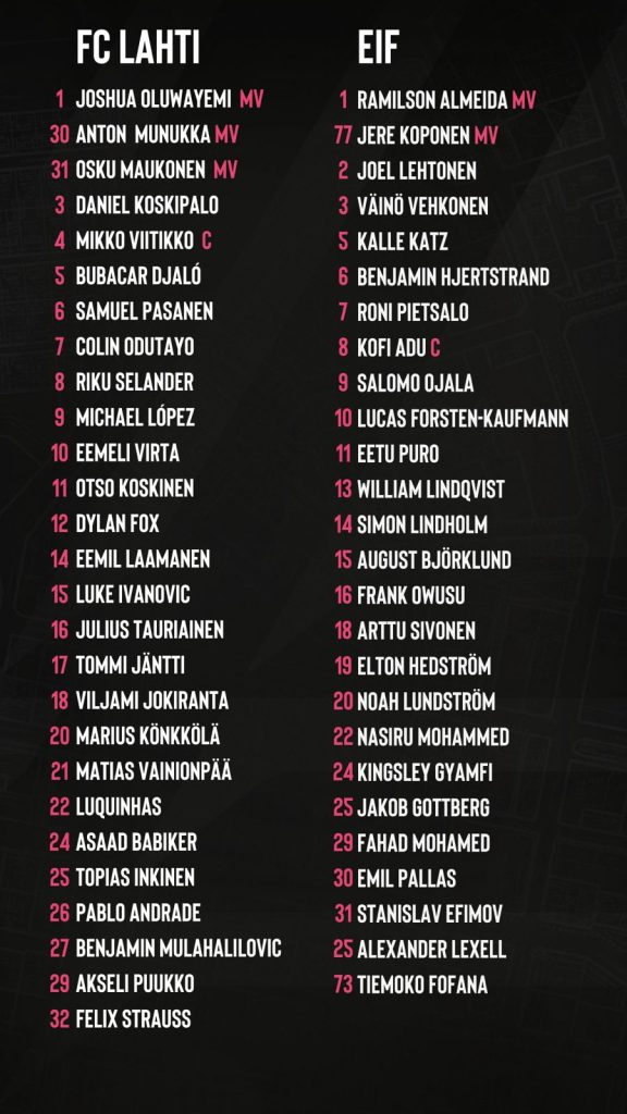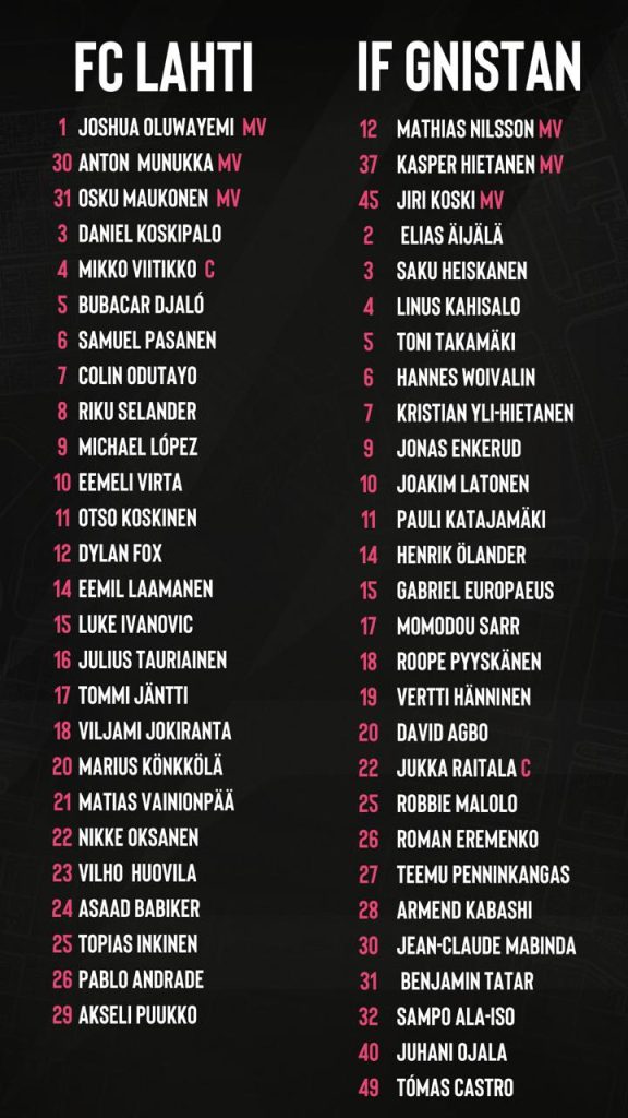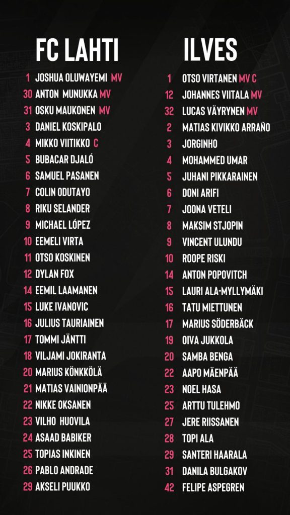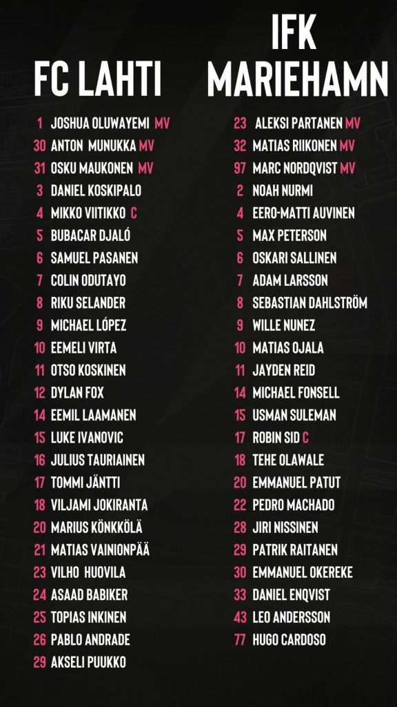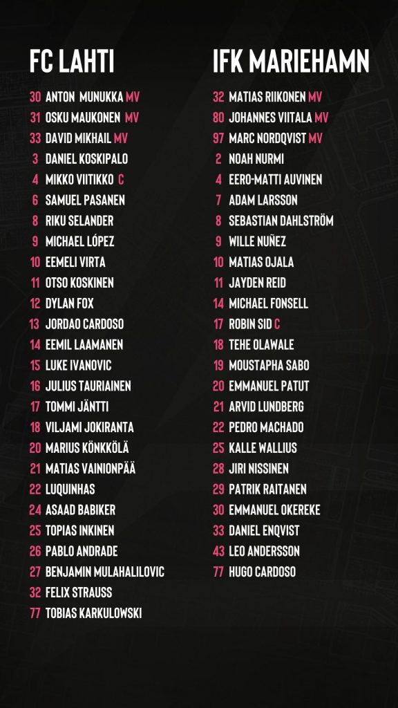 FC Lahti ja IFK Mariehamn ovat yhä tasapisteissä ja Lahti on karsintaviivan yläpuolella vain maalieron turvin. Kun runkosarjaa on jäljellä vain kaksi kierrosta, on jokainen piste tärkeä asetelmia alempaan loppusarjaan hakiessa. Illan otteluun Lahti joutuu varmasti lähtemään ilman pitkäaikaispotilaita Julius Tauriaista ja Daniel Koskipaloa. Samuel Pasanen ja Dylan Fox ovat puolestaan osallistuneet viikon harjoituksiin täysipainoisesti. Eemeli Virta ja saarella kentän ennen aikojaan jättämään joutunut Jordão Cardoso ovat puolestaan harjoitelleet muuta joukkuetta kevyemmin. Etenkin jälkimmäiselle kaksikolle sunnuntain ottelu tulee vastaan hieman liian aikaisin.