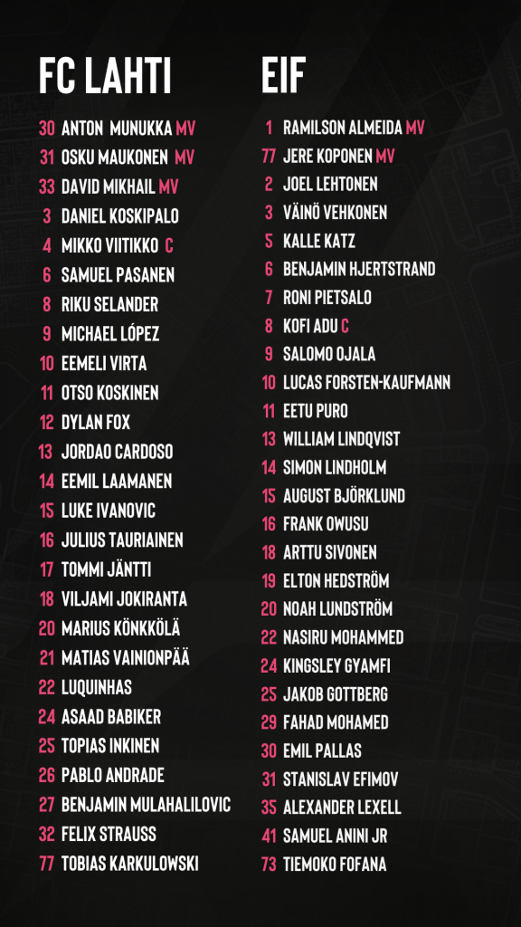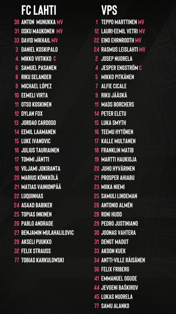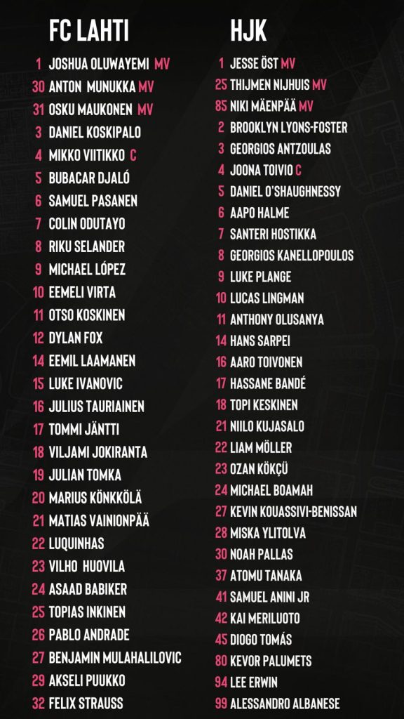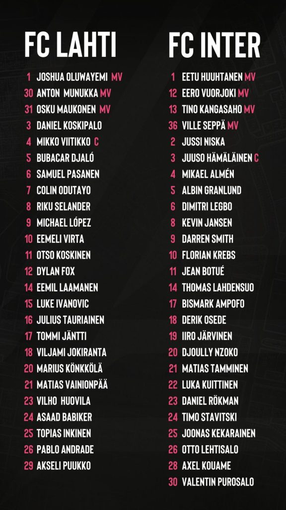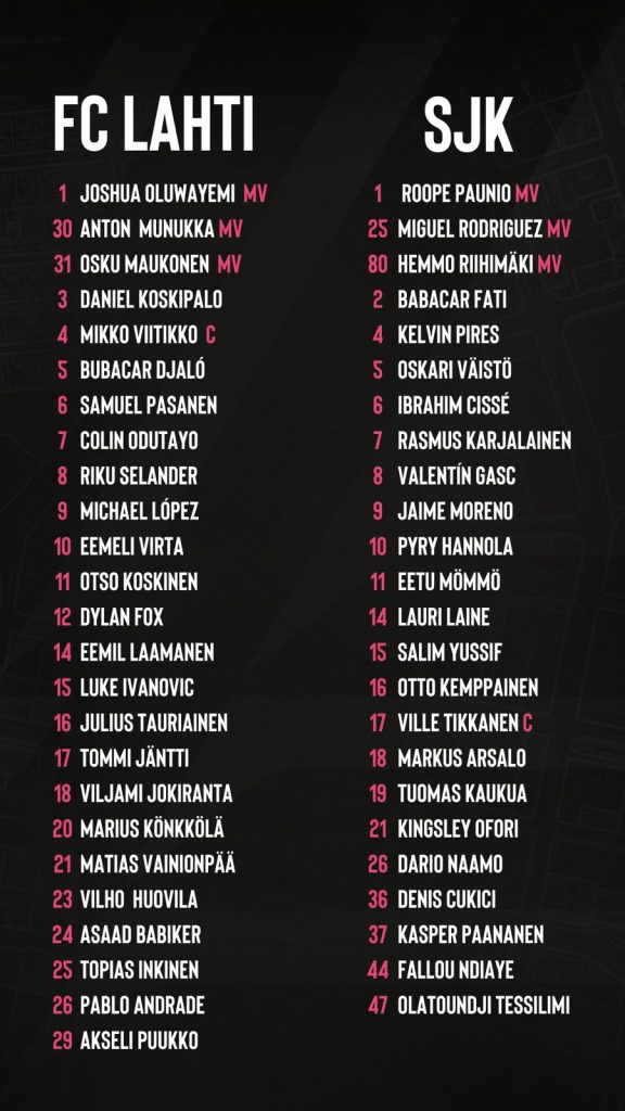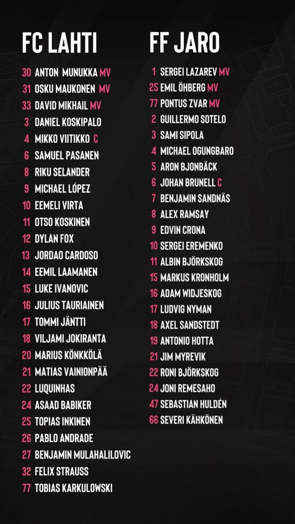 Lahti pääsee ratkaisevaan otteluun hyvistä asetelmista. Sivussa ovat ainoastaan pitkäaikaispotilaat Julius Tauriainen, Daniel Koskipalo ja Eemil Laamanen. Lisäksi Jordão Cardoson pelikielto jatkuu vielä tämän ottelun verran. Anton Munukka ja Asaad Babiker aloittivat maanantaina varusmiespalveluksensa, joten heidän pelaamisensa on epävarmaa. Joukkueen valmennus saa jälleen käyttöönsä Luquinhasin, joka on pelikieltonsa kärsinyt.