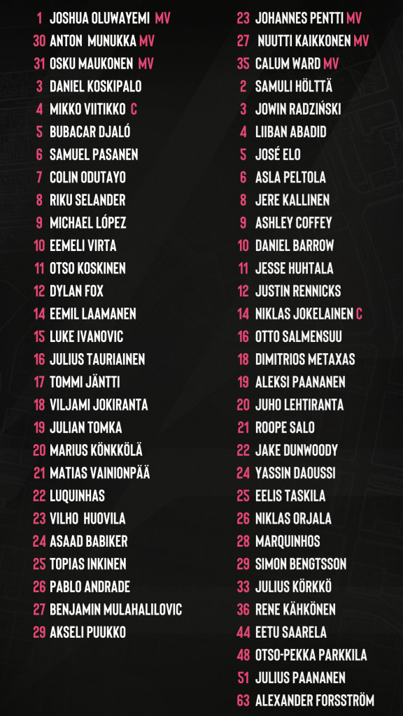 Viime otteluissa Lahti on saanut sairastuvalta pieniä apuja, kun kokoonpanoon ovat palanneet Andraden lisäksi Luke Ivanovic, Dylan Fox ja Michael López. Myös Eemeli Virta on lähellä paluutaan. Varmasti ottelu jää väliin Daniel Koskipalolta ja Topias Inkiseltä. Heidän lisäkseen Vilho Huovila ja Osku Maukonen ovat maajoukkueen matkassa.