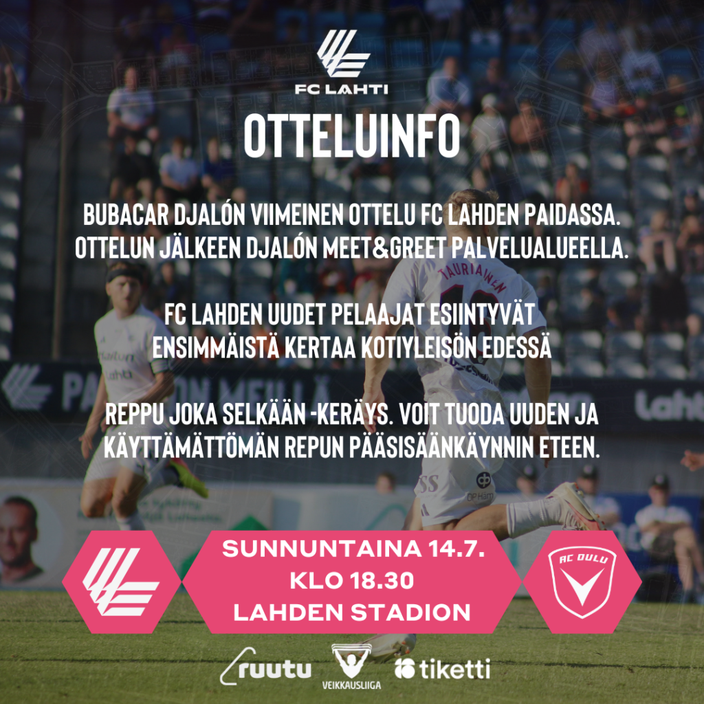 Ottelu jää Bubacar Djalón viimeiseksi otteluksi FC Lahden paidassa, sillä rakastettu keskikenttämies siirtyy ottelun jälkeen isommille areenoille. Djalón pelaamisessa on kuitenkin vielä pieni varjo yllä, sillä hänen Oulunkylässä saama vamma on ollut valitettavan sitkeä. Djalón on kuitenkin pystynyt harjoittelemaan tämän viikon joukkueen mukana täydellä teholla.