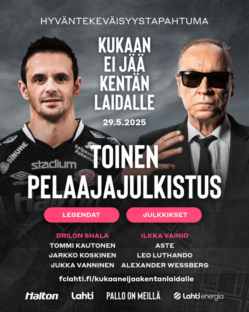 On Thursday, 29 May 2025, a charity event “No One Left on the Sidelines” will take place at Toolpoint Areena to raise funds for the FC Lahti Support Fund, helping cover the football expenses of children from low-income families. The event will culminate in a match between FC Lahti Legends and a team of Finnish celebrities.