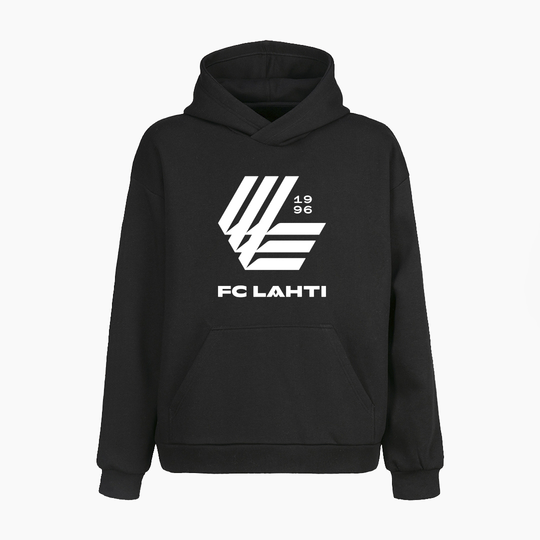 Tyylikäs musta FC Lahden 1996 -logolla varustettu huppari.