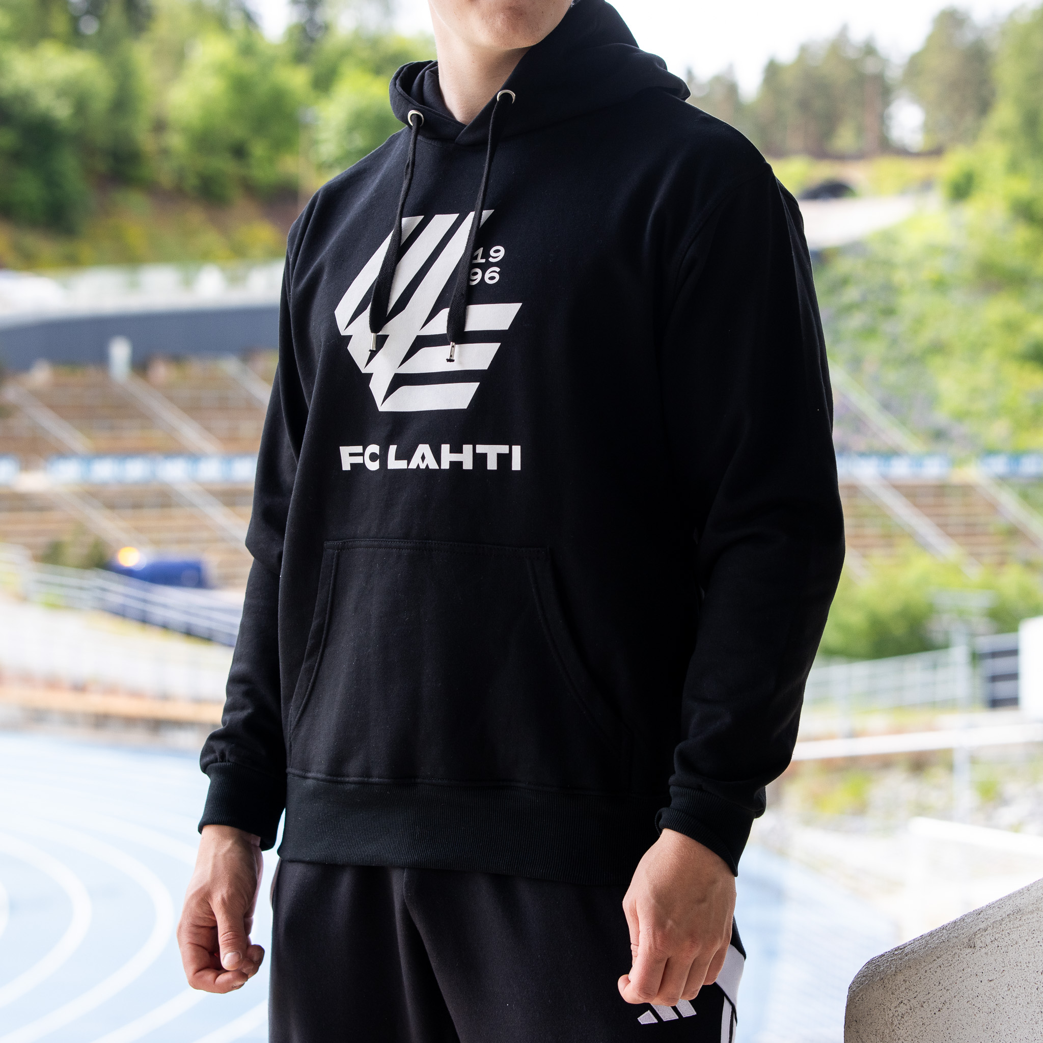 Tyylikäs musta FC Lahden logolla varustettu huppari.