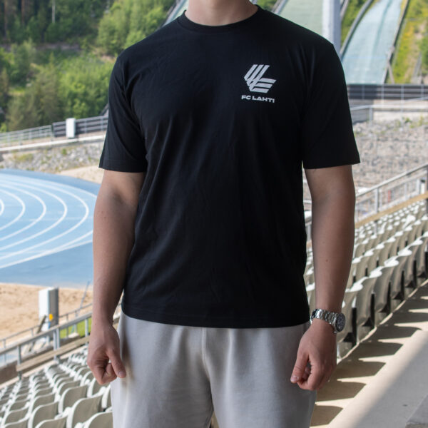 Pyöreä pääntie, lyhyet hihat ja tyylikäs FC Lahti -logo vasemmalla rinnassa.