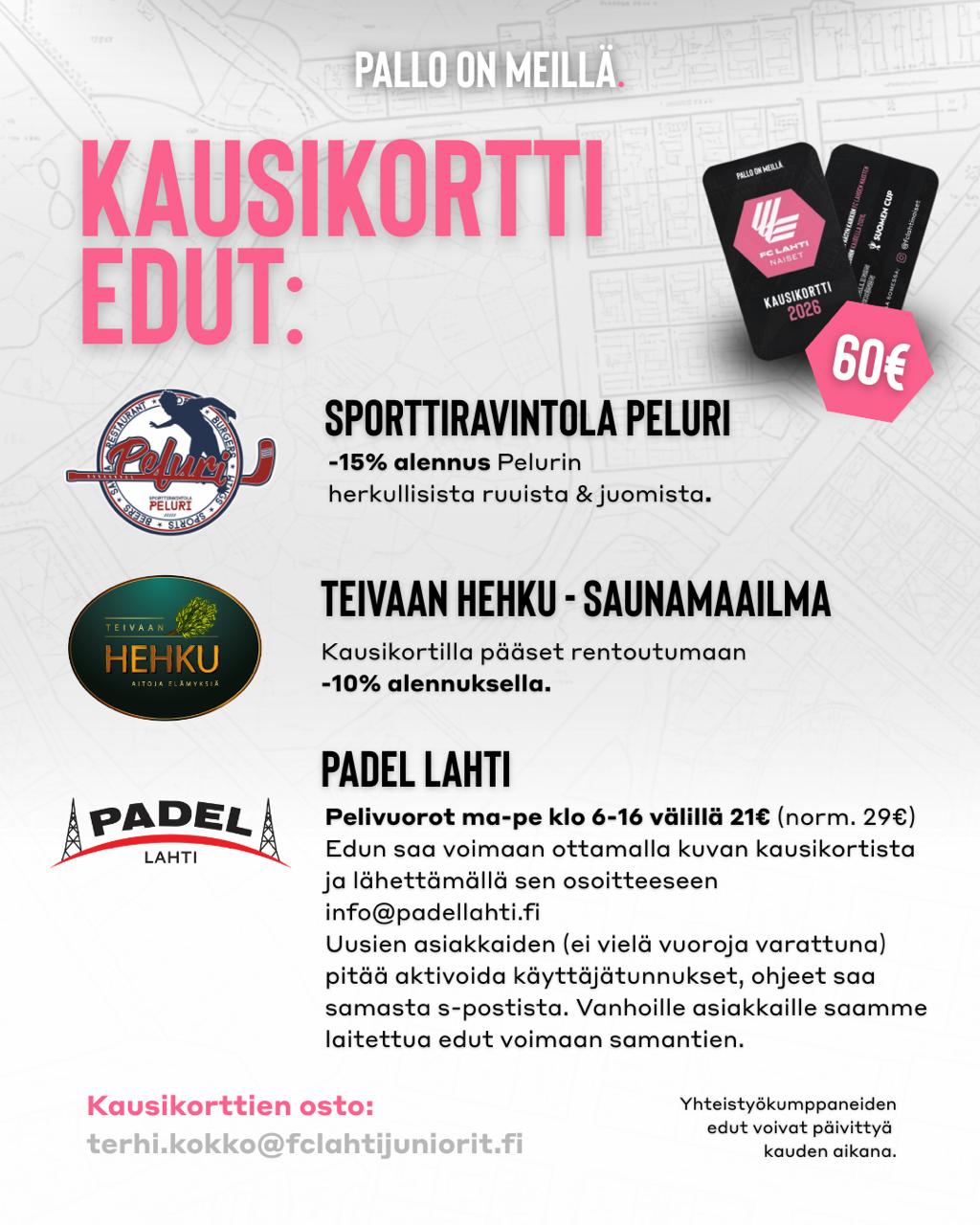 (junioreille seuran jäsenkortilla sekä FC Lahden miesten kausikortilla