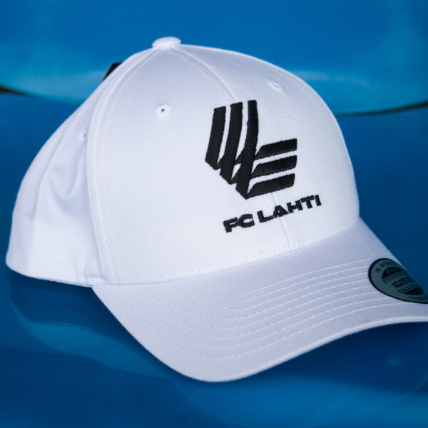 Valkoinen lippalakki mustalla FC Lahti -logolla.