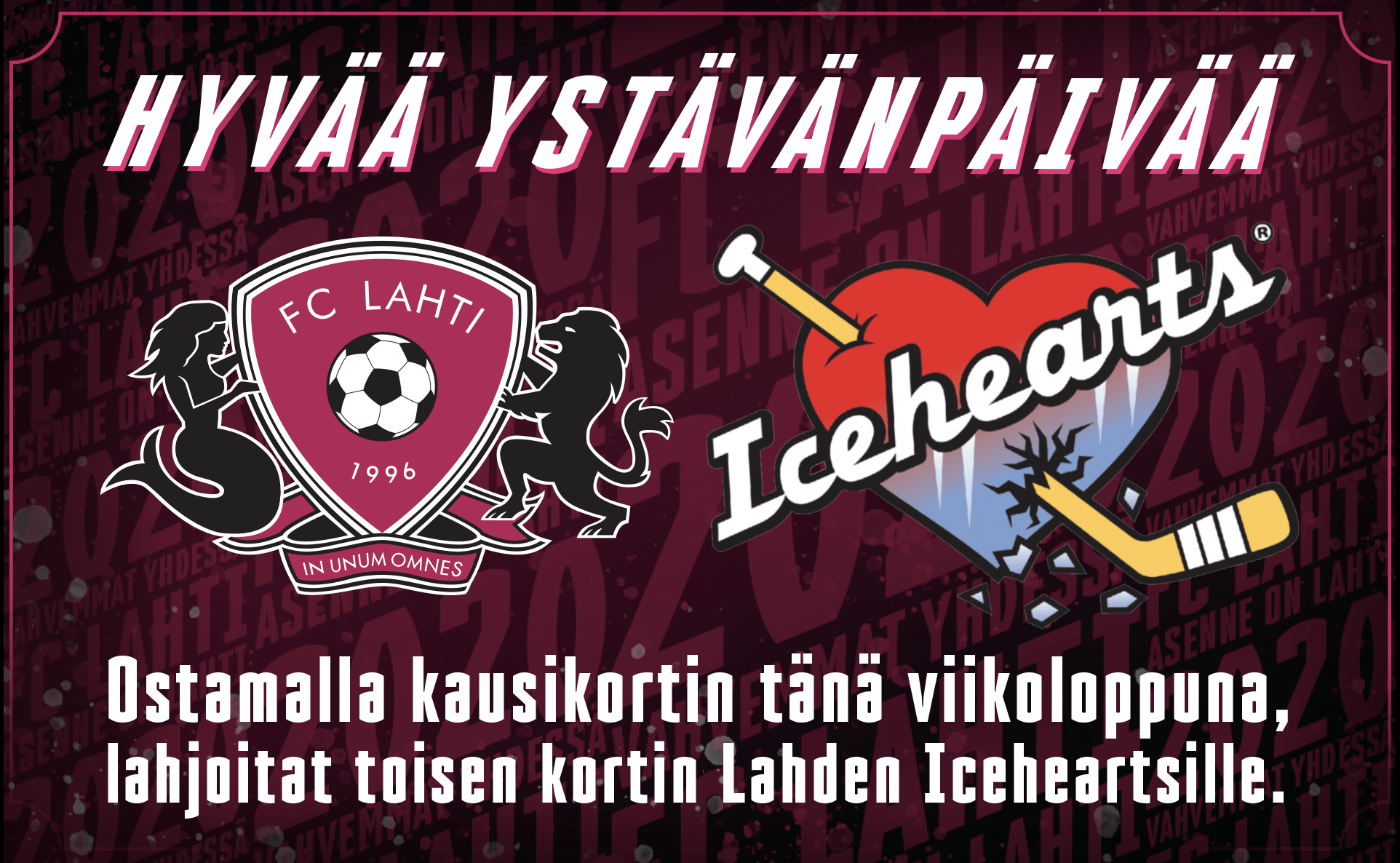FC Lahti tarjoaa ystävänpäivän kunniaksi loistavan mahdollisuuden tehdä hyvää. Osta kausikortti ystävänpäiväviikonloppuna itsellesi tai ystävällesi, niin FC Lahti lahjoittaa yhden ylimääräisen kausikortin hyväntekeväisyyteen Icehearts ry:lle.