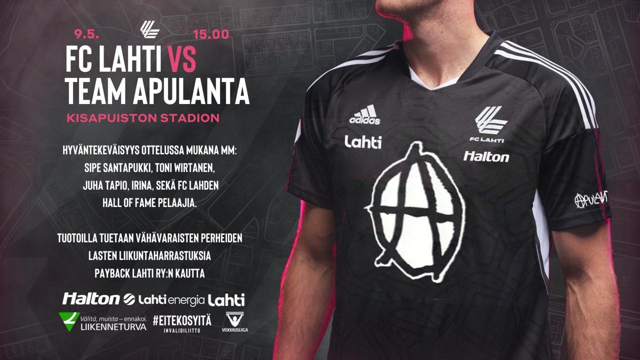 FC Lahti ja Apulanta järjestävät helatorstaina 9.5. yhdessä hyväntekeväisyysottelun Kisapuistossa. FC Lahden legendat kohtaavat huippusuositun Apulannan joukkueen, jossa pelaa viihdemaailman kirkkaimpia tähtiä. Tapahtuman tuotto käytetään vähävaraisten perheiden liikuntaharrastusten tukemiseen. Hyväntekeväisyysottelun lisäksi Kisapuistossa on myös muuta ohjelmaa koko perheille. FC Lahden edustusjoukkueen pelaajat ovat paikalla liikuttamassa lapsia koko tapahtuman ajan. Tapahtuma alkaa kello 13 ja hyväntekeväisyysottelu kello 15.