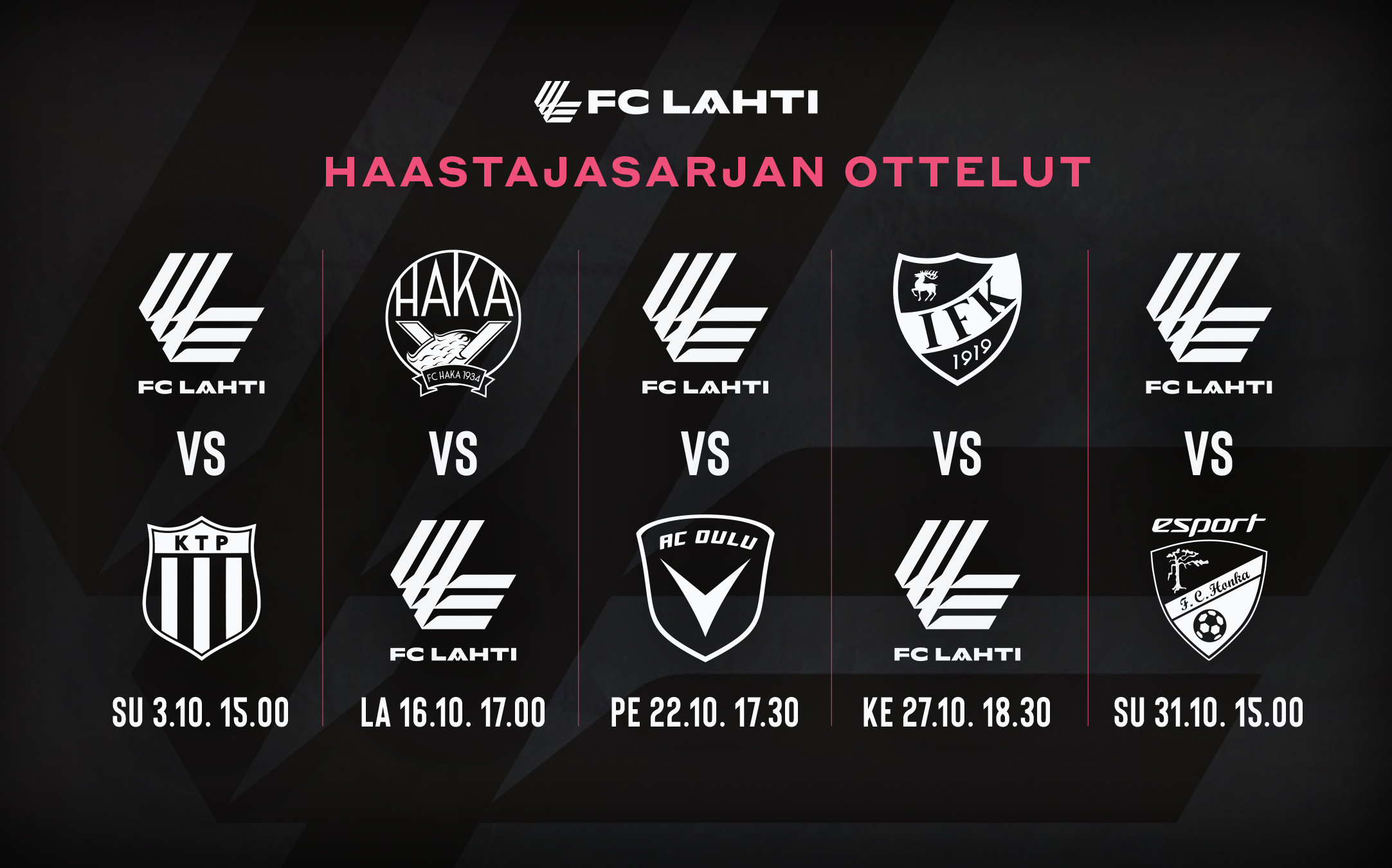 Maaottelutauon jälkeen Lahti matkaa Valkeakoskelle lauantaina 16.10. jossa se kohtaa FC Hakan. Perjantaina 22.10. Lahteen saapuu vieraaksi AC Oulu. Kauden viimeinen vieraspeli pelataan keskiviikkona 27.10. saarella IFK Mariehamnia vastaan.
