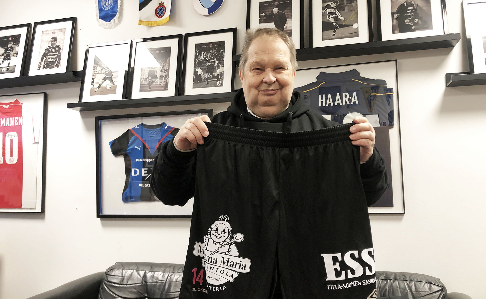 “Tapsa” toi myös tuliaisia FC Lahden toimistolle. Muun muassa tämän HJK:n europelihuivin “Töölön ihmeestä”.