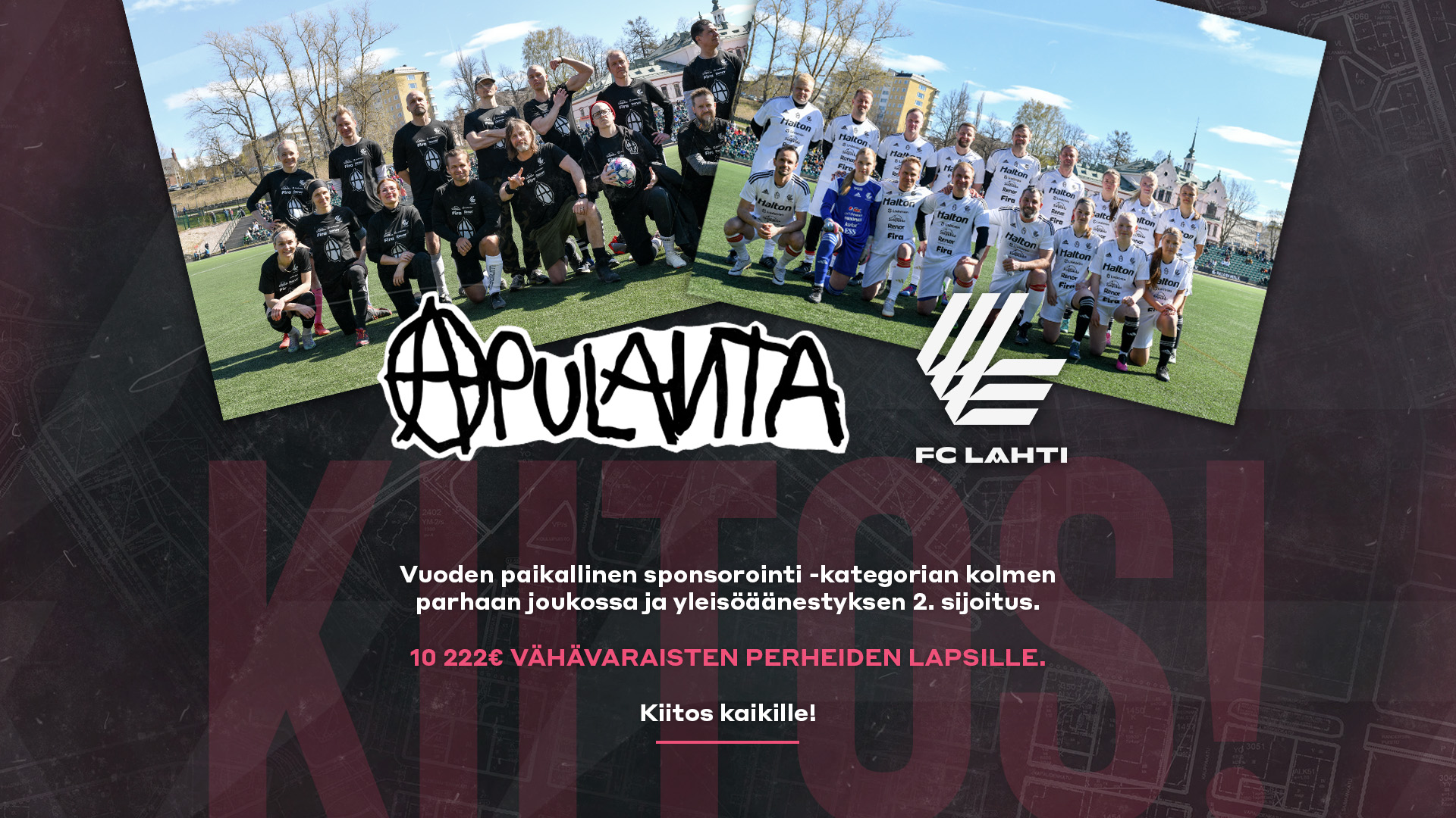 FC Lahden ja Apulannan yhteisen tempauksen tavoitteena oli kerätä varoja vähävaraisten perheiden lapsille, jotta kaikilla olisi mahdollisuus kokea liikkumisen riemua kentällä. Kisapuistossa FC Lahden legendat kohtasivat Team Apulannan hyväntuulisessa ottelussa, joka keräsi paikalle runsaan ja innostuneen yleisön. Upean yhteisön tuella tapahtuma tuotti huikeat 10 222 euroa lasten liikuntaharrastusten tukemiseen.