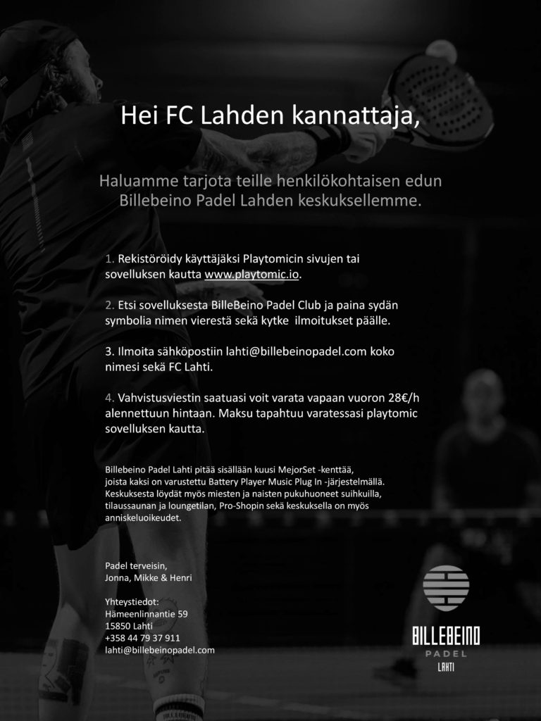 FC Lahti sekä Billebeino Padel yhteistyöhön! Yhteistyön myötä FC Lahden seuraajat saavat käyttöönsä edun, joka mahdollistaa entistä edullisemman padel-kentän käytön.