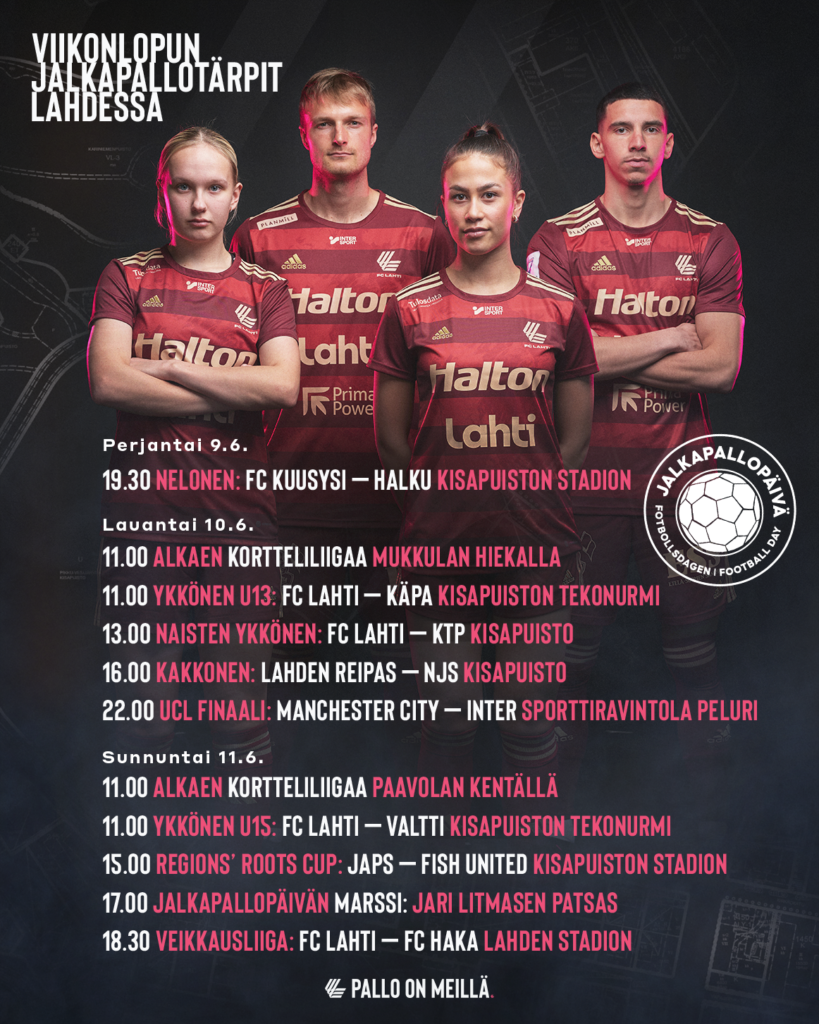 Sunnuntaina 11.6. on Jalkapallopäivä. Historian ensimmäistä Jalkapallopäivää vietetään ympäri Suomea ja Jalkapallopäivä näkyy isosti koko viikonlopun aikana myös Lahdessa. Perinteisen jalkapallokaupungin viikonlopun ohjelmaan kuuluvat kymmenien junioriotteluiden lisäksi muun muassa FC Lahden edustusjoukkueiden kotipelit ja yhteistyöseura Lahden Reippaan kotiottelu.