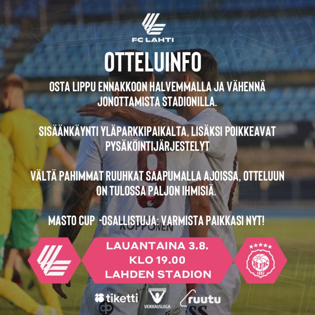 Lauantainen FC Lahden ja Helsingin Jalkapalloklubin välinen Veikkausliiga-ottelu aiheuttaa pieniä muutoksia järjestelyissä. Luethan ohjeet tarkasti ja saavuthan paikalle ajoissa, jotta vältät mahdolliset ruuhkat. Ottelun ennakkoliput myy Tiketti.