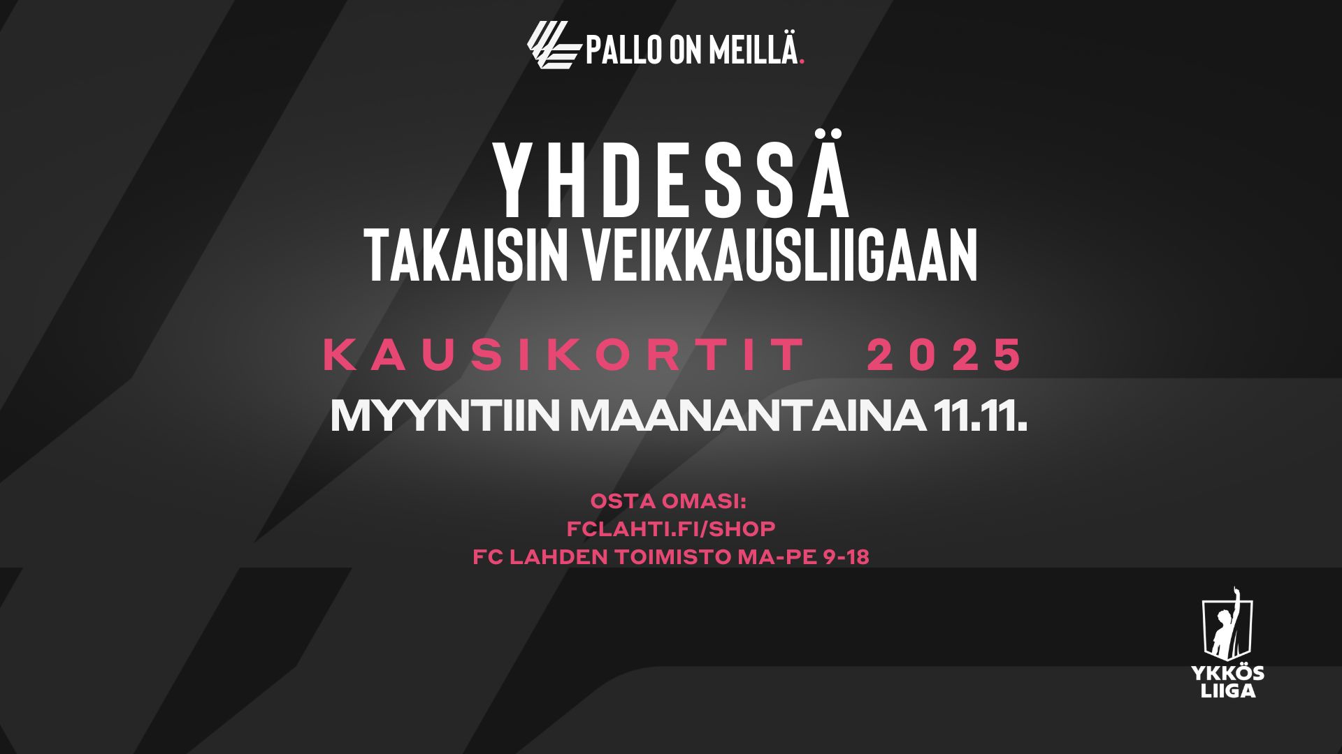 FC Lahden kausikortit tulevalle kaudelle tulevat myyntiin maanantaina 11.11. kello 9.00. Viikko käynnistyy huimalla tarjouksella ja kausikortin saa hintaan 99 euroa. Kausikortin normaalihinta on 149 euroa. Etu on voimassa sunnuntaihin 17.11. asti. Tavoitteena on nousu takaisin Veikkausliigaan, joten lahtelaisyleisön tuki on tarpeen. Tehdään Hiihtiksestä yhdessä linnake, jota ei voi valloittaa.