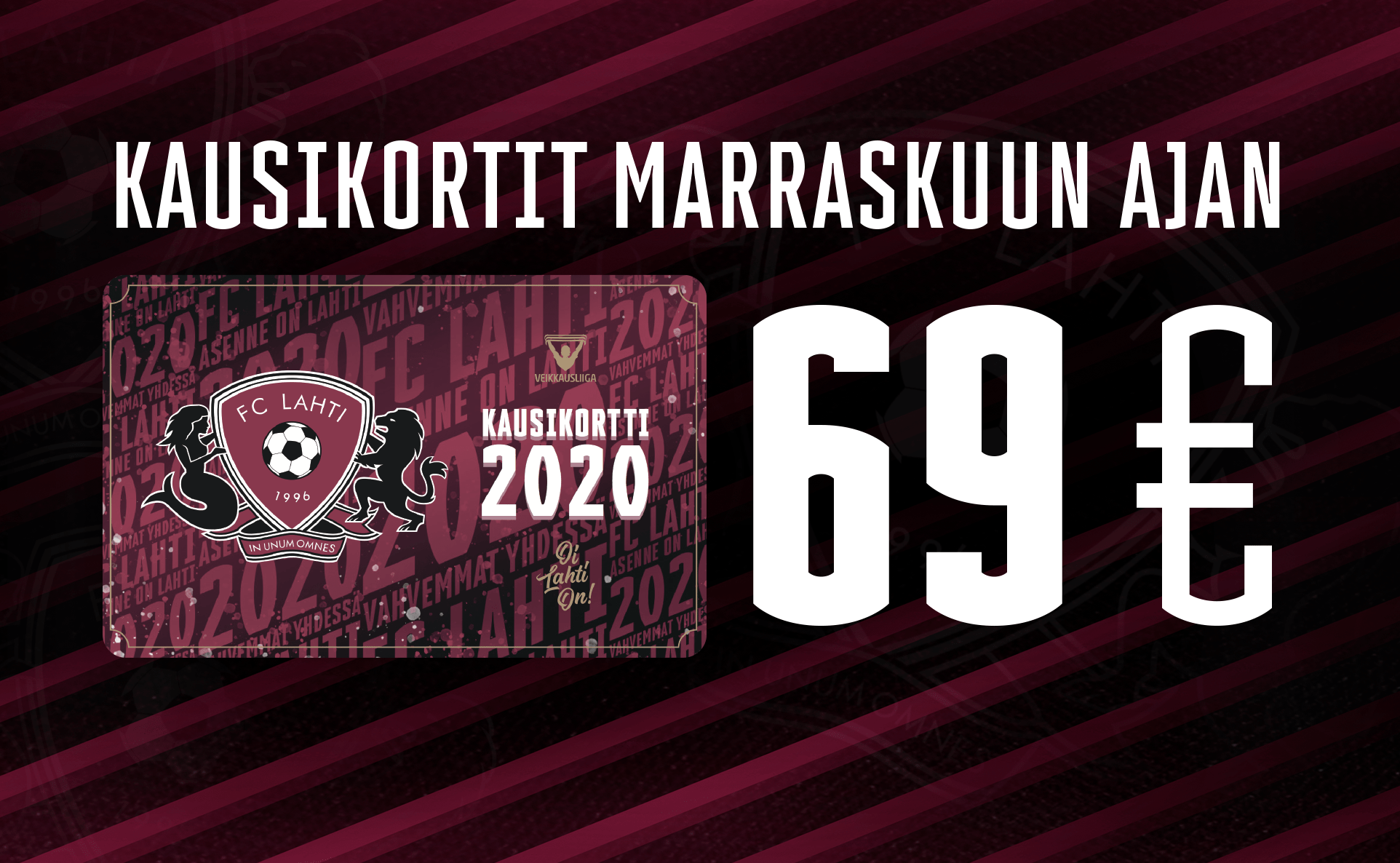 FC Lahden toimisto palvelee kausikorttiostoksissa huomenna keskiviikkona 27.11. poikkeuksellisesti kello 18.00 asti (norm. klo 9-16). Kausikortin maksuvälineenä käy perinteisten maksutapojen lisäksi Smartumin kulttuuriseteli, Epassi, Eazybreak, Edenred, Tyky Kuntoseteli ja Virikeseteli.