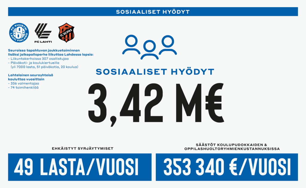Lahtelainen jalkapalloperhe, FC Lahti, FC Kuusysi ja FC Reipas, tuottaa UEFA SROI-mallinuksen mukaan talousalueelleen vuosittain 17,7 miljoonan euron hyödyt. Junioriseurojen ydintoiminta ennaltaehkäisee muun muassa sairauksia. Vuositasolla 57 diabetes- ja 21 masennustapausta aikaansaa merkittäviä terveydellisiä vaikutuksia. Sosiaalisia hyötyjä tuottaa esimerkiksi seurojen laajamittainen koulu- ja päiväkotiyhteistyö sekä kouluttaminen. Taloudellisten vaikutusten arvoon vaikuttavat harrastajien maksut sekä työpaikkojen luominen.