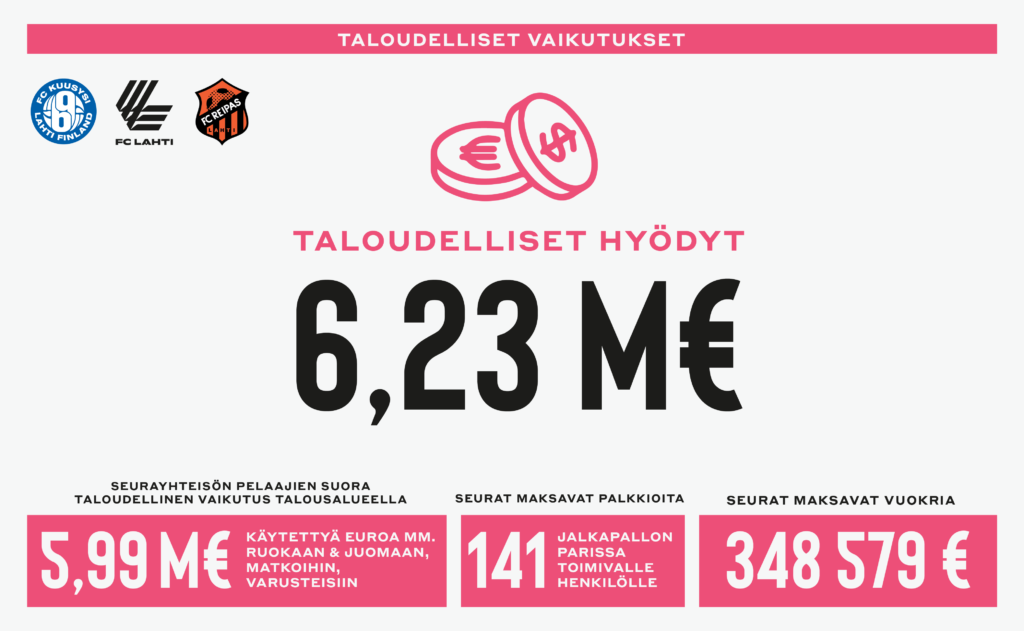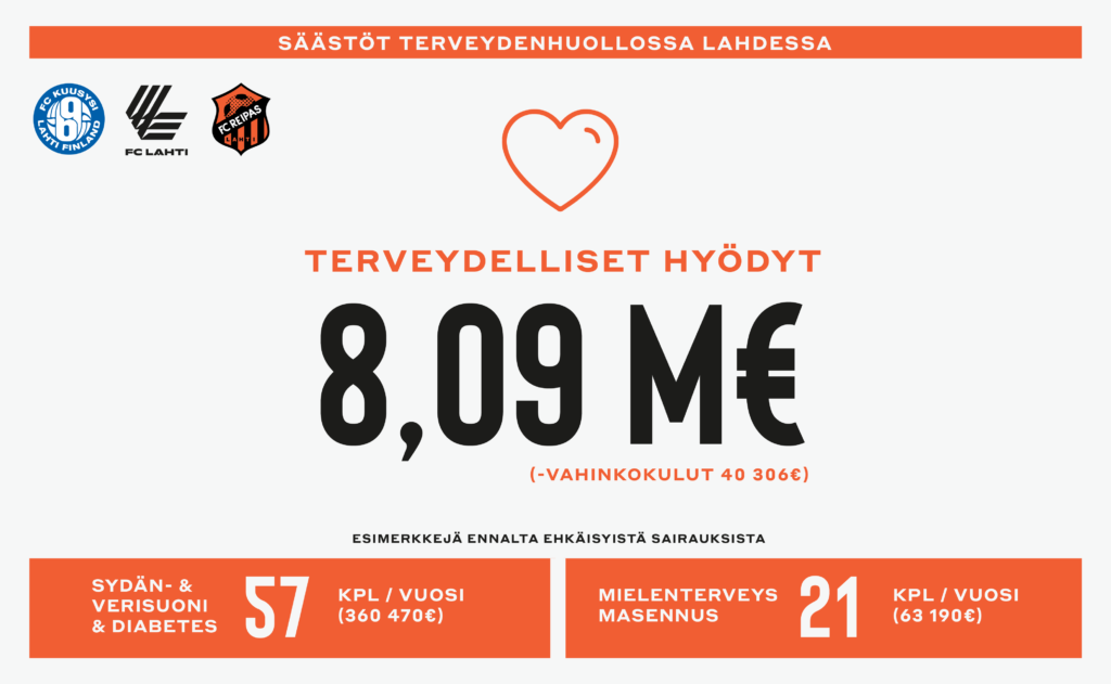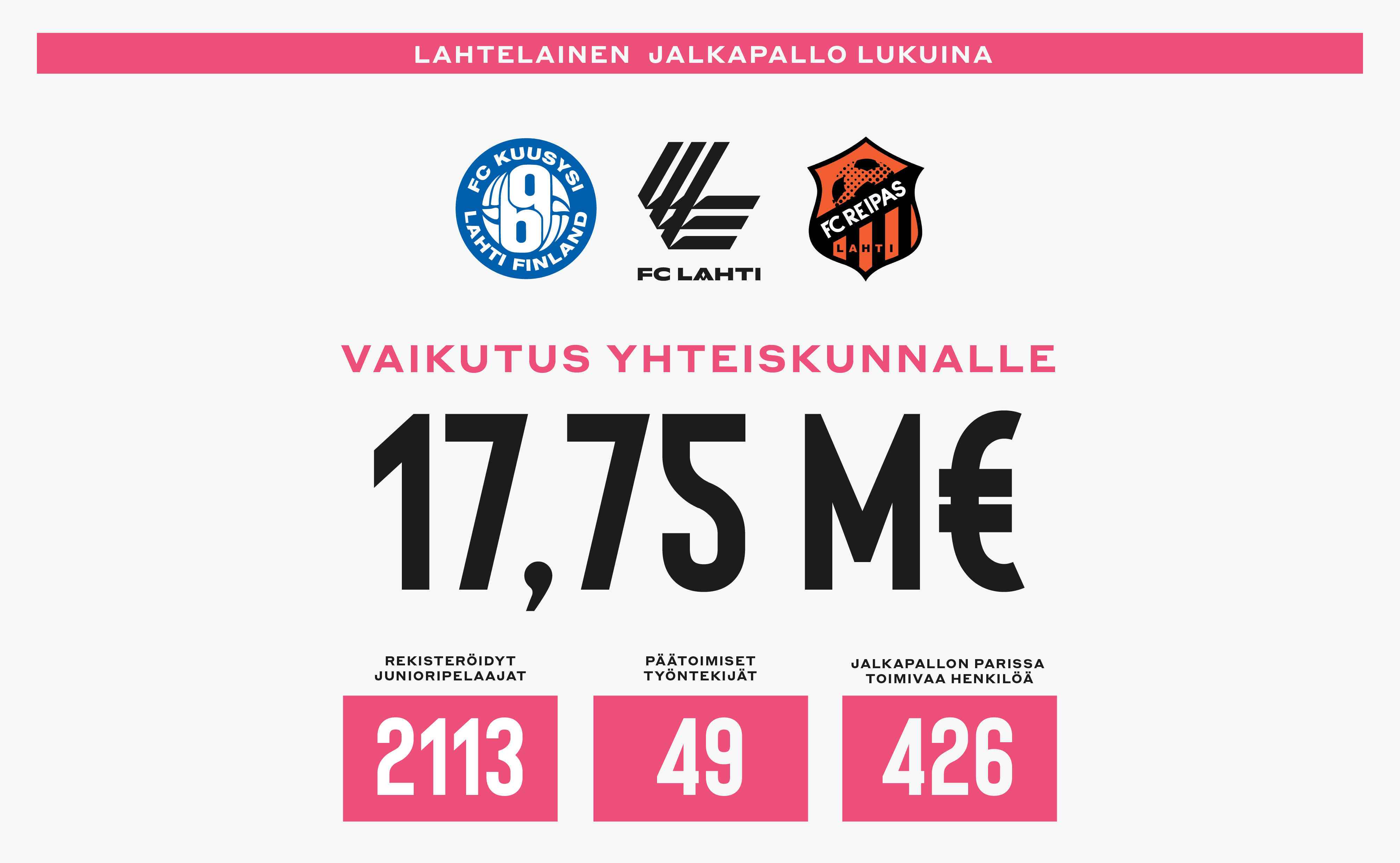 - Jalkapallo on harrastajamäärältään Suomen ja maailman suosituin laji. Liikunnan ja urheilun vaikutukset ovat laajasti tunnettu. Olemme ylpeitä siitä, että Euroopan kattojärjestö UEFA on mahdollistanut meille toimintamme konkretisoinnin lukujen kautta. Mallinnuksen kautta muodostuneita lukuja voi miettiä myös kääntäen – miltä luvut näyttäisivät, jos FC Lahden, FC Kuusysin ja FC Reippaan toimintaa ei olisi lainkaan, pohtii FC Lahden toimitusjohtaja Juho-Matti Heikari.