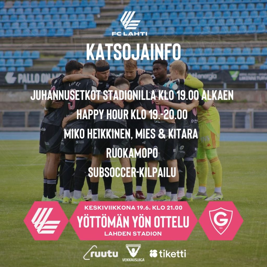 Keskiviikko on pelipäivä ja Hiihtiksellä juhlitaan juhannusetkoja. Etkoille yöttömän yön otteluun FC Lahti saa vieraakseen IF Gnistanin. Portit aukeavat kello 19.00 ja itse ottelu alkaa kello 21.00. Otteluliput ennakkoon myy Tiketti ja ottelun suorana kotisohville välittää Ruutu.
