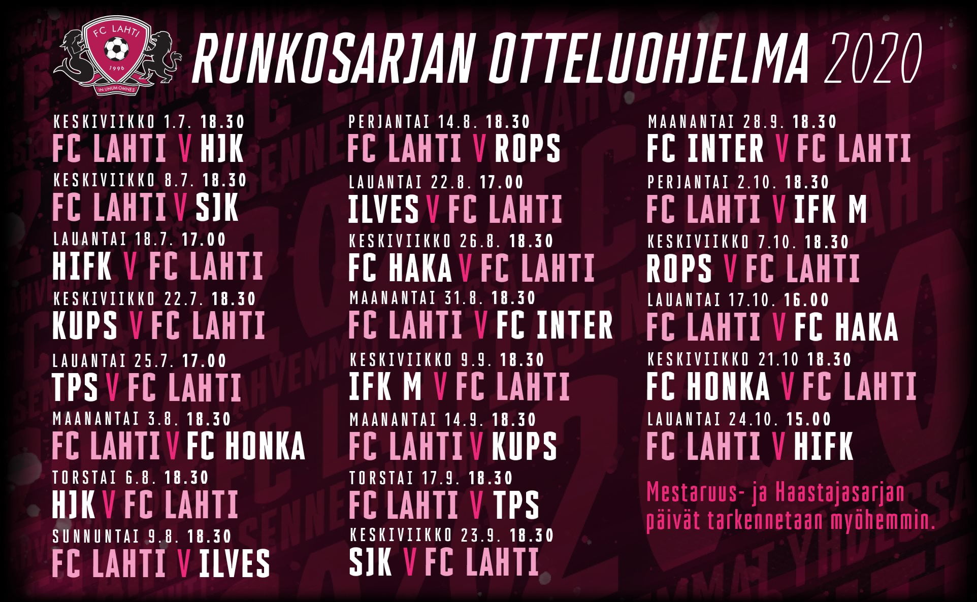 Myös FC Lahti aloittaa liigakautensa 1.7. jolloin Lahteen saapuu vieraaksi Helsingin Jalkapalloklubi. Ensimmäinen vierasottelu on Helsingissä IFK:a vastaan lauantaina 18.7. Veikkausliigan runkosarja päättyy alustavasti 24.10. jolloin Lahteen saapuu Helsingin IFK.