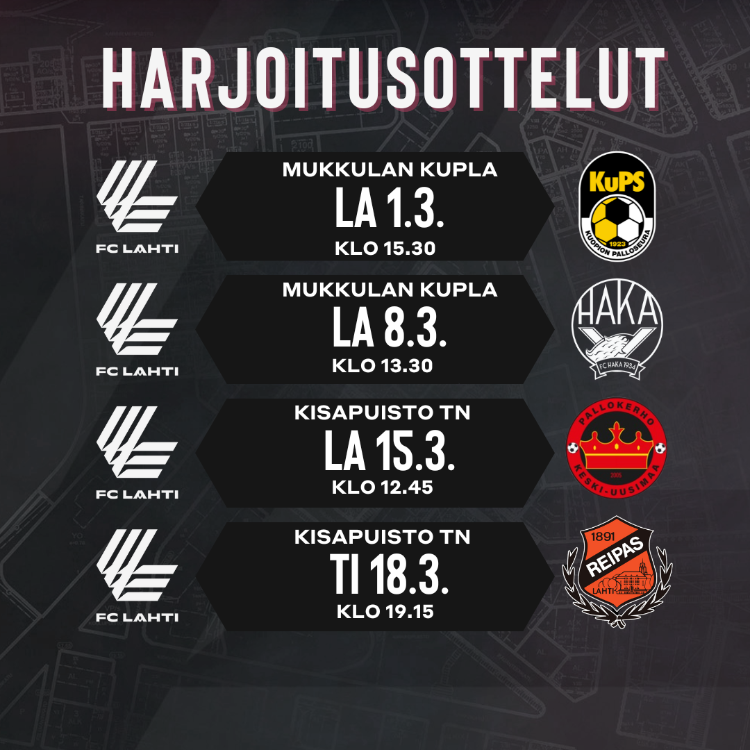 FC Lahti jatkaa valmistautumista tulevaan sarjakauteen tukulla harjoitusotteluita. Ensimmäisenä Lahteen saapuu vieraaksi tulevana lauantaina 1.3. hallitseva Suomen mestari ja Cup-voittaja Kuopion Palloseura. Ottelu Mukkulan kuplassa alkaa kello 15.30.