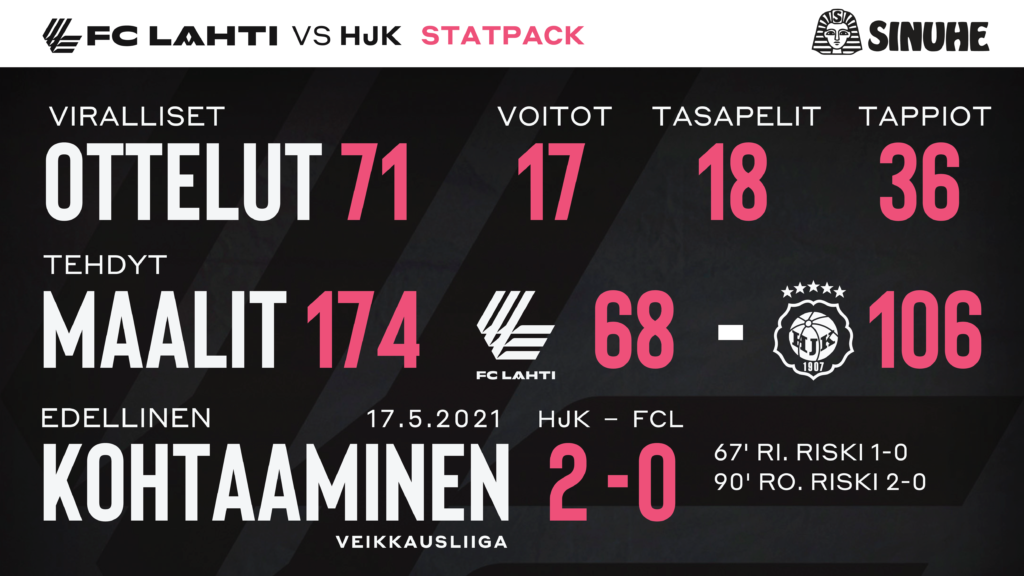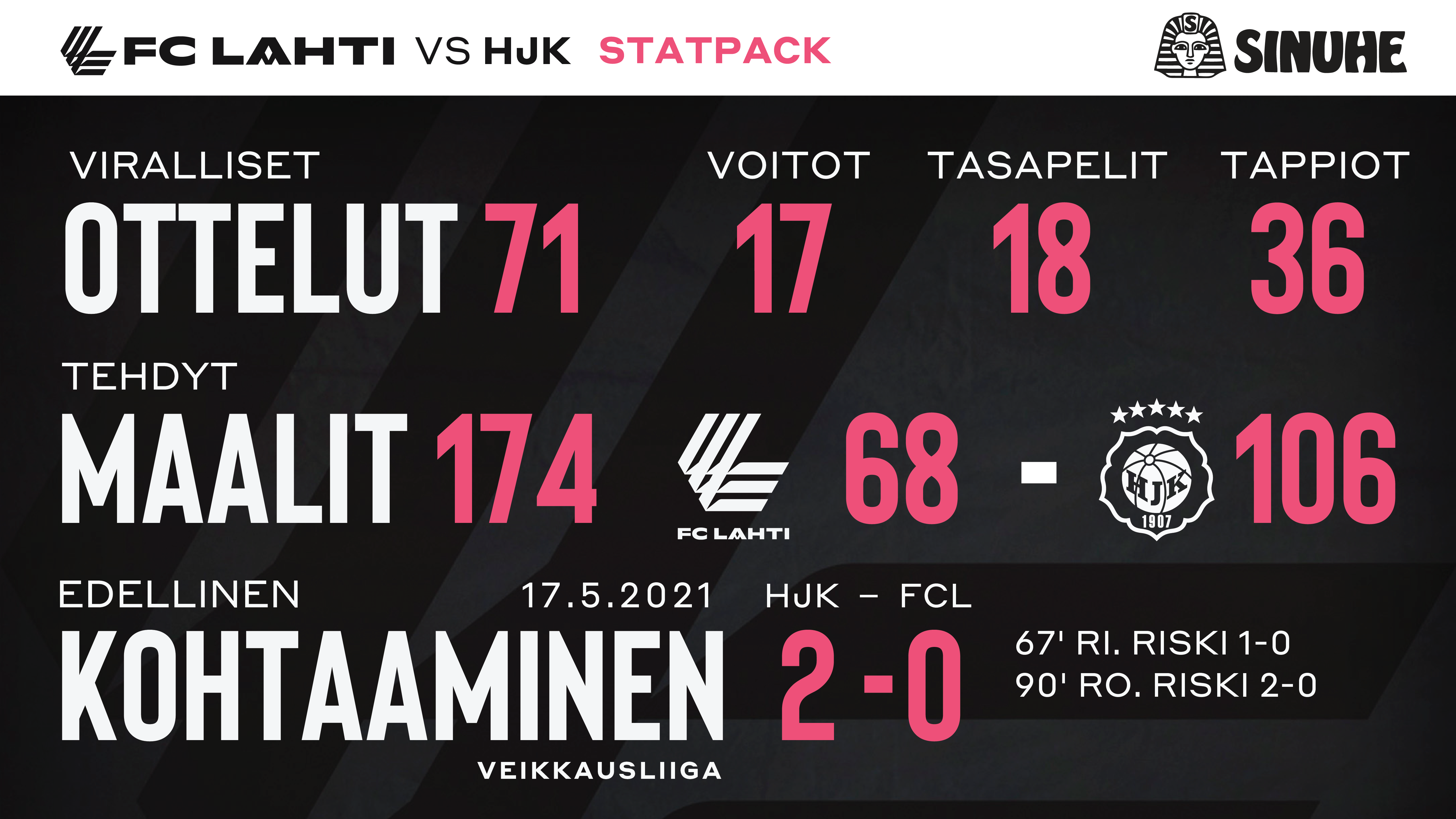 FC Lahti on kohdannut Helsingin Jalkapalloklubin virallisissa otteluissa 71 kertaa. Mustapaidat ovat voittaneet näistä kamppailuista 17 ja pisteet on tasattu 18 kertaa. Maaleja mastokaupungin pojat ovat iskeneet HJK:n verkkoon 68, kun taas Klubi on rokottanut Lahtea jo 106 kertaa.