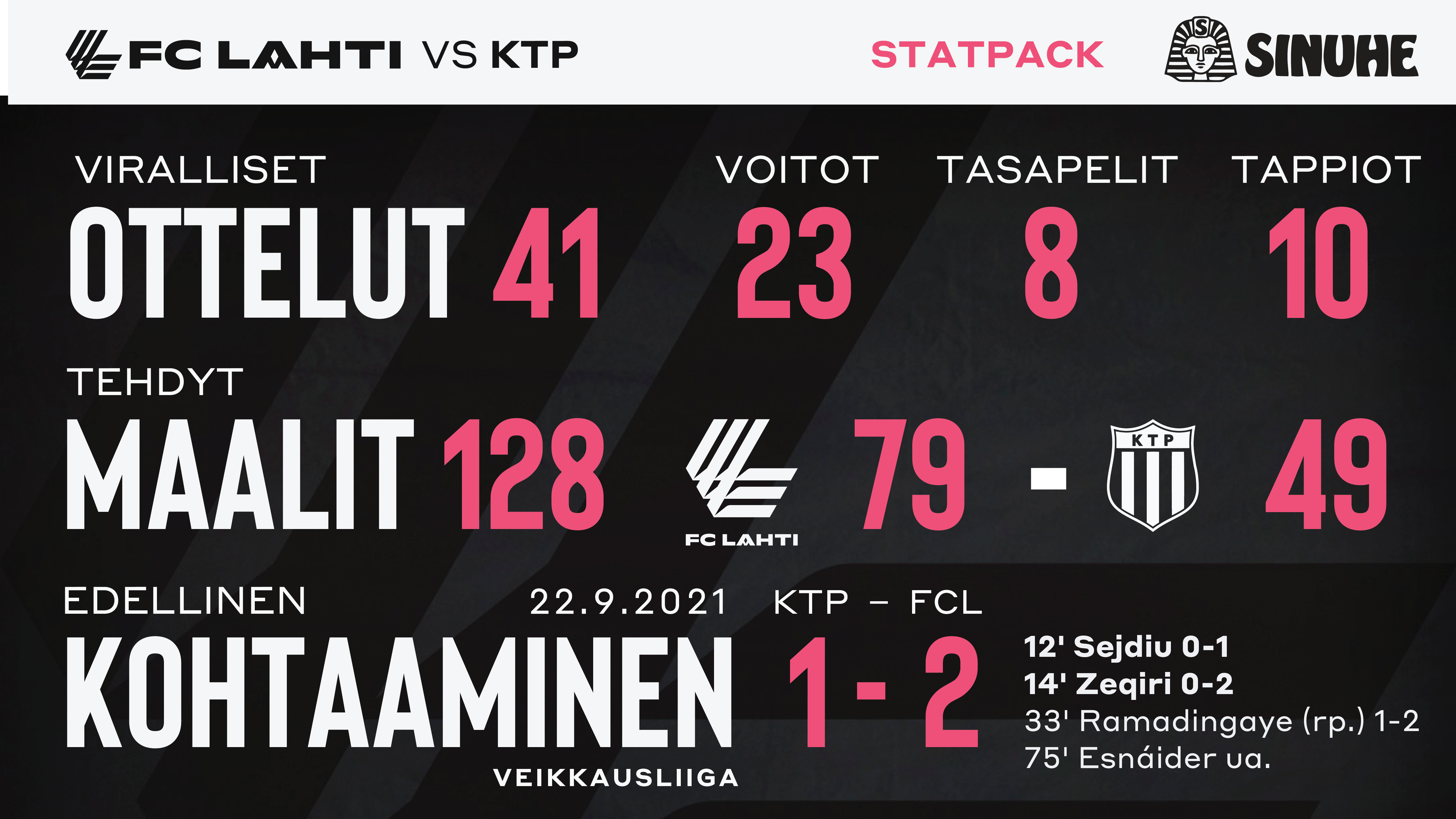 Liigassa Lahti otti 3-0-kotivoiton ja vastikään 2-1-vierasvoiton. Arlind Sejdiu iski avausmaalin Macoumba Kandjin esityöstä ja Altin Zeqiri vei lahtelaiset 2-0-johtoon. David Ramadingaye kavensi rangaistuspotkulla, mutta KTP:n kirisaumat kariutuivat viimeistään vartti ennen loppua, kun Juan Esnáiderin nappasi toisen keltaisen kortin.