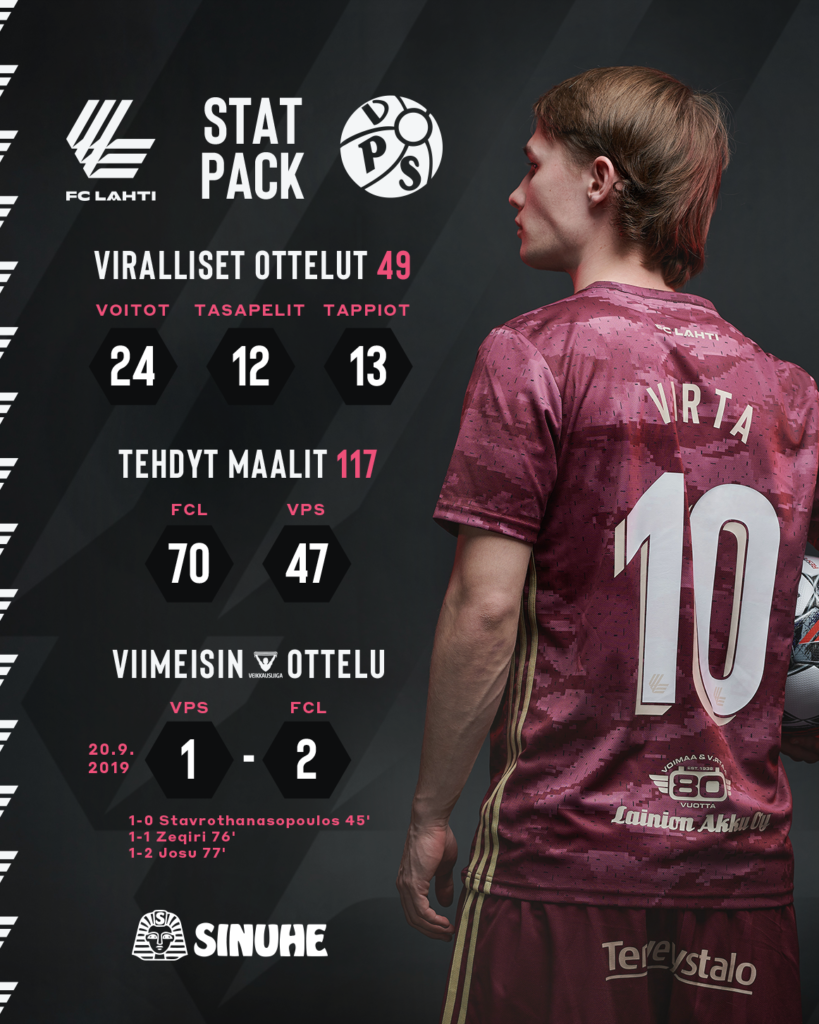 Sinuhe-statpack: FC Lahti ja VPS ovat kohdanneet toisensa virallisissa otteluissa 49 kertaa. FC Lahti on tilastoissa vahvasti johdossa, sillä otteluista 24 on päättynyt lahtelaisten voittoon. Mastokaupungin pojat ovat mättäneet maaleja jo 70 kappaletta. VPS puolestaan 47.