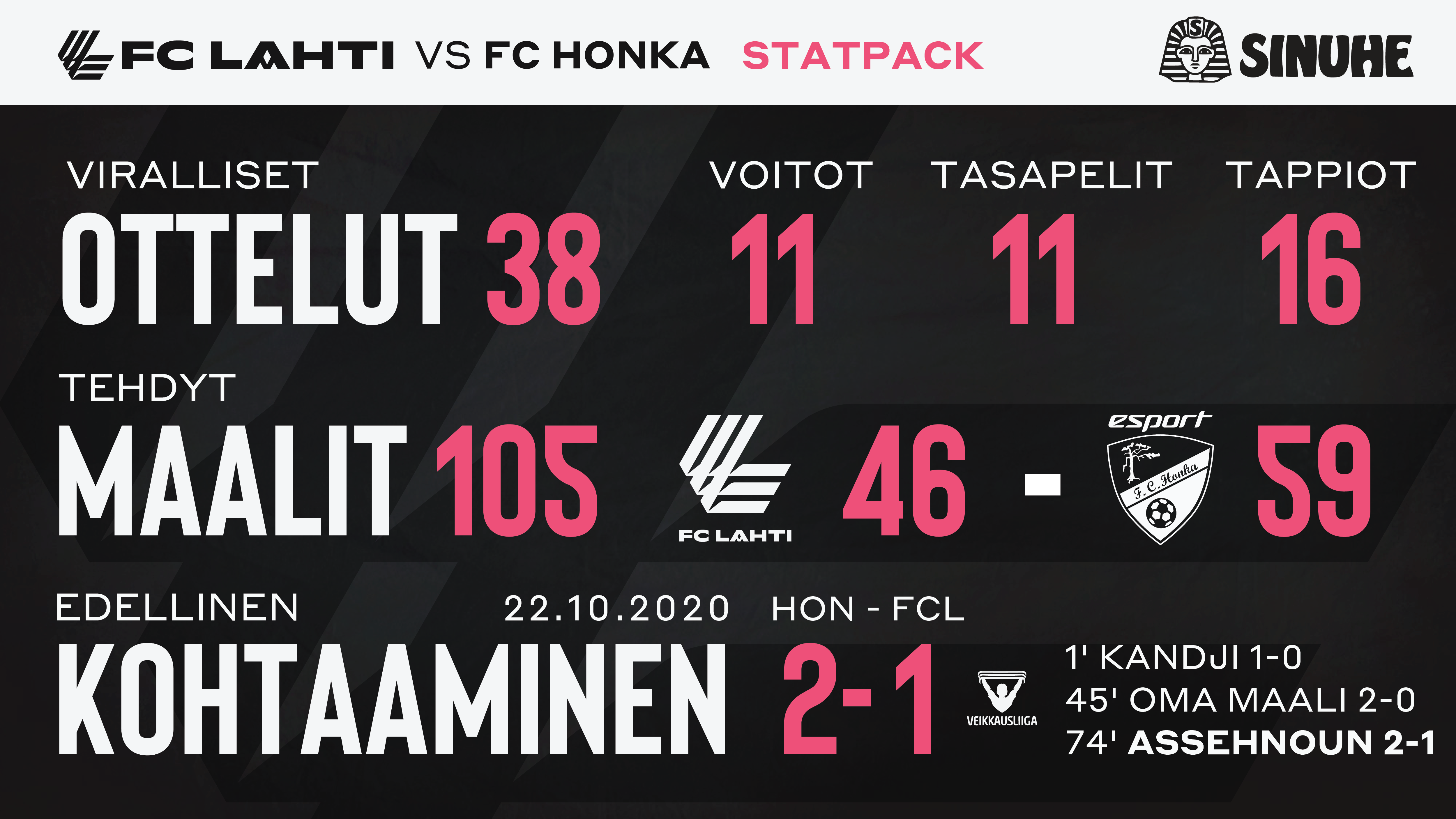 #2 Putki: FC Lahti on onnistunut kotikentällään hyvin Honkaa vastaan. Lahti on napannut neljästä edellisestä Lahdessa pelatusta Honka-ottelusta pisteitä. Edellisen kerran Honka on voittanut liigaottelun Lahdessa heinäkuussa 2013. Hongan Kastriot Kastrati iski ottelun ainoan maalin Jesse Jorosen selän taa pelin ensimmäisellä jaksolla. Joukkueiden nykyisistä miehistöistä mukana olivat Loorents Hertsi ja Hongan Dani Hatakka ja Henri Aalto.