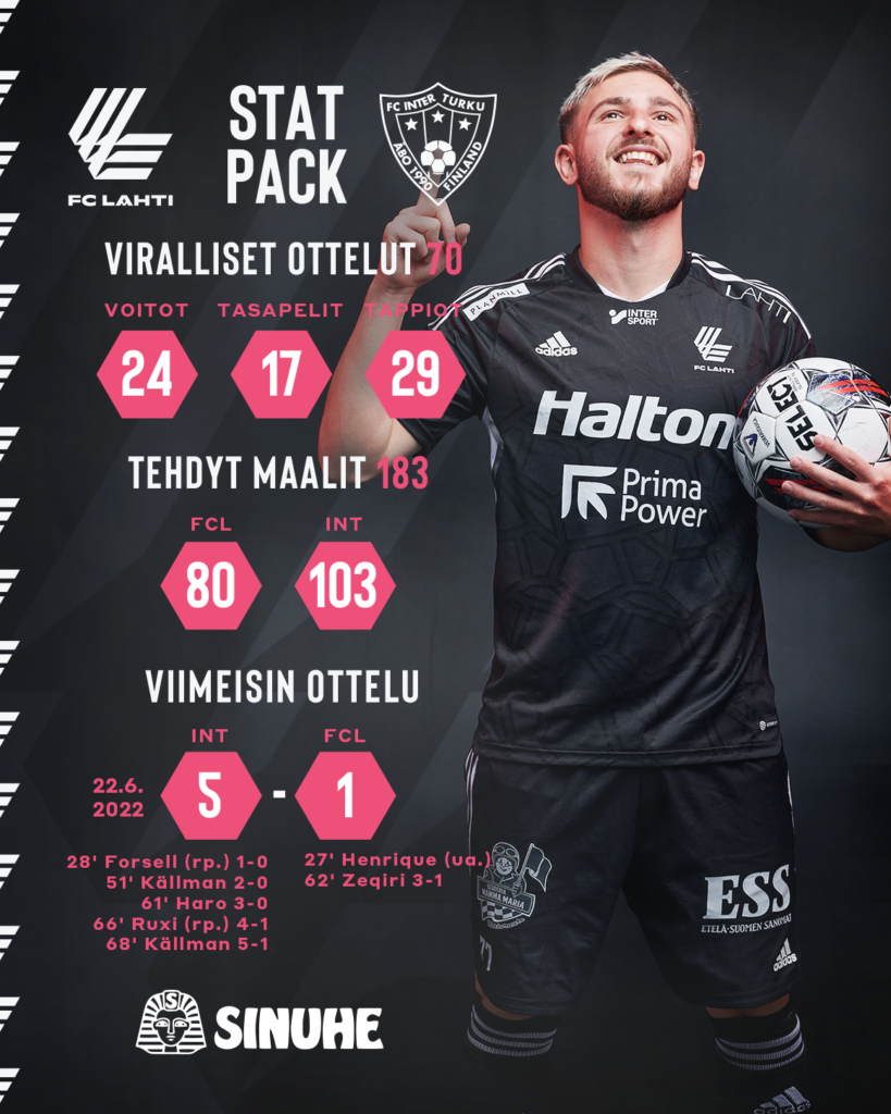 FC Lahti ja FC Inter ovat kohdanneet toisensa jokaisessa suomalaisessa kilpailussa, johon FC Lahti on osallistunut. Yhteensä virallisia otteluita kaksikon välillä on pelattu 70. Niistä Lahti on voittanut 24 ja Inter 29. Inter meni edellisessä ottelussa yli sadan osuman, sillä Inter voitti juhannusviikolla kotonaan 5-1. Altin Zeqirin 3-1-kavennusosuma oli lahtelaisten 80. Lahti joutui ottelussa alivoimalle ja Inter käytti sen hyväksi.