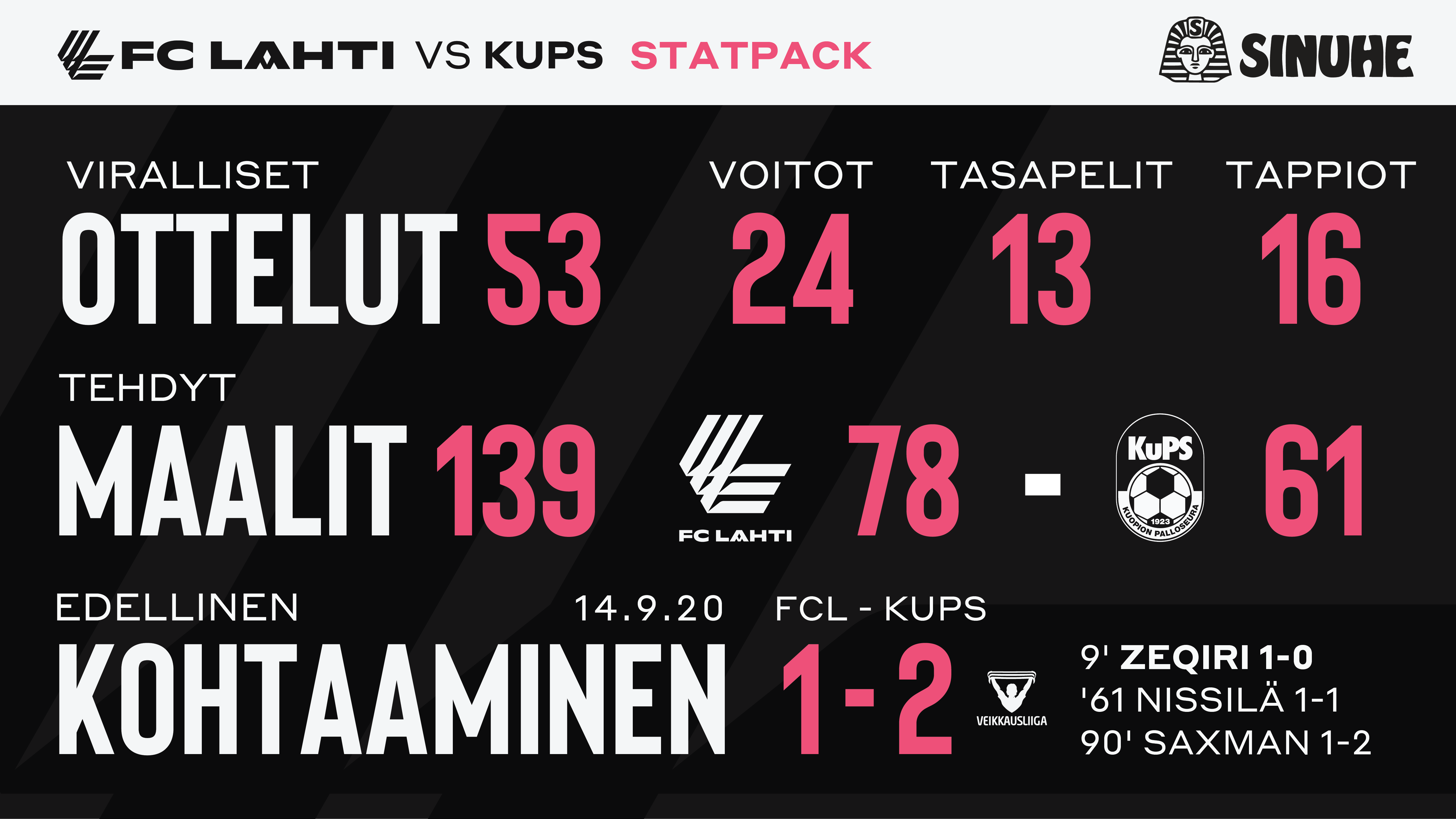FC Lahti ja Kuopion Palloseura ovat kohdanneet toisensa virallisissa otteluissa 53 kertaa. Mastokaupungin pojat ovat tilastoissa edellä Kanarianlintuja, sillä lahtelaiset ovat juhlineet voittoa 24 kertaa Palloseuran 16 vastaan. Maaleja mastokaupungin pojat ovat tehneet 78 kappaletta, siinä missä Hymyilevän Hanneksen kaupungin keltamustat ovat iskeneet 61 maalia. Viime vuosina KuPS on ollut selkeästi niskan päällä, sillä Lahden edellistä voittoa saa hakea kaudelta 2018 saakka, jolloin Santeri Hostikan ainokainen riitti voittoon.