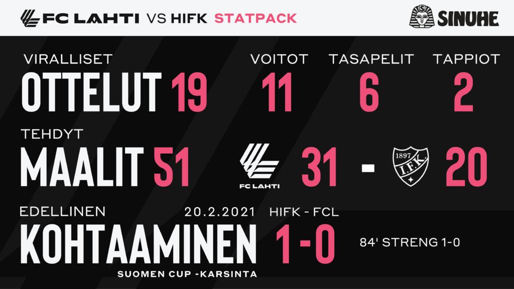 FC Lahti on kohdannut Helsingin IFK:n virallisissa otteluissa 19 kertaa. Yhteensä Lahdella on voittoja 11. IFK on voittanut keskinäisistä kohtaamisista vain kaksi, joista toinen tuli tämän kauden Suomen Cupin karsinnassa Jeremiah Strengin loppuhetken maalilla. FC Lahti on iskenyt otteluissa 31 osumaa HIFK:n 20:tä vastaan.
