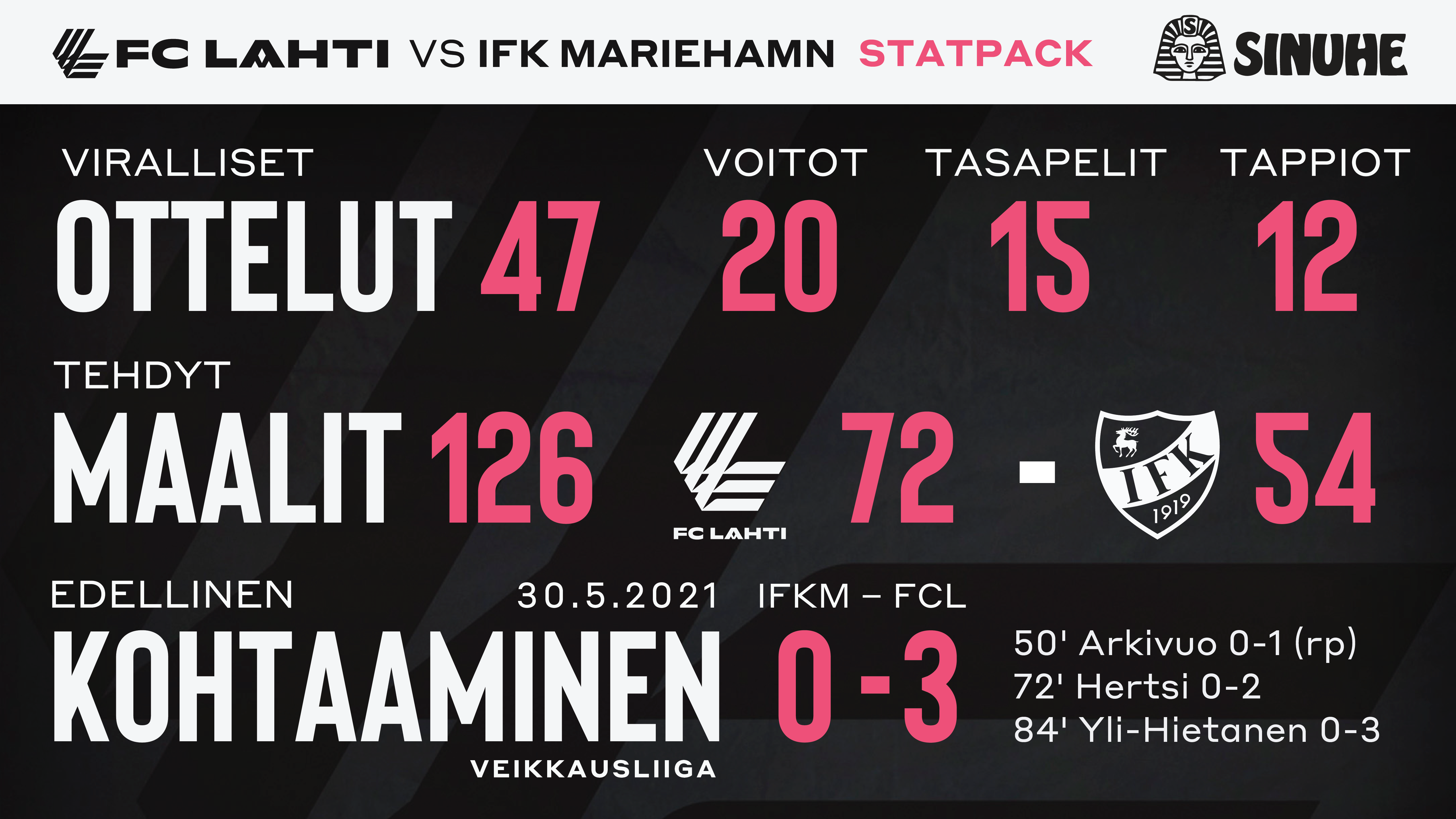 FC Lahti ja IFK Mariehamn ovat kohdanneet toisensa virallisissa otteluissa 47 kertaa. Mastokaupungin pojat ovat voittaneet näistä 20 ja 15 kertaa on päädytty tasatulokseen. Maaleja lahtelaiset ovat tehneet yhteensä 72 IFK:n saldon ollessa 54. Joukkueet kohtasivat toisensa toukokuun lopussa Maarianhaminassa. Kari Arkivuo vei Lahden rangaistuspotkulla johtoon ja Loorents Hertsi ja Kristian Yli-Hietanen osuivat maalipuiden väliin Arkivuon jälkeen. Yli-Hietaselle maali oli liiga uran ensimmäinen.