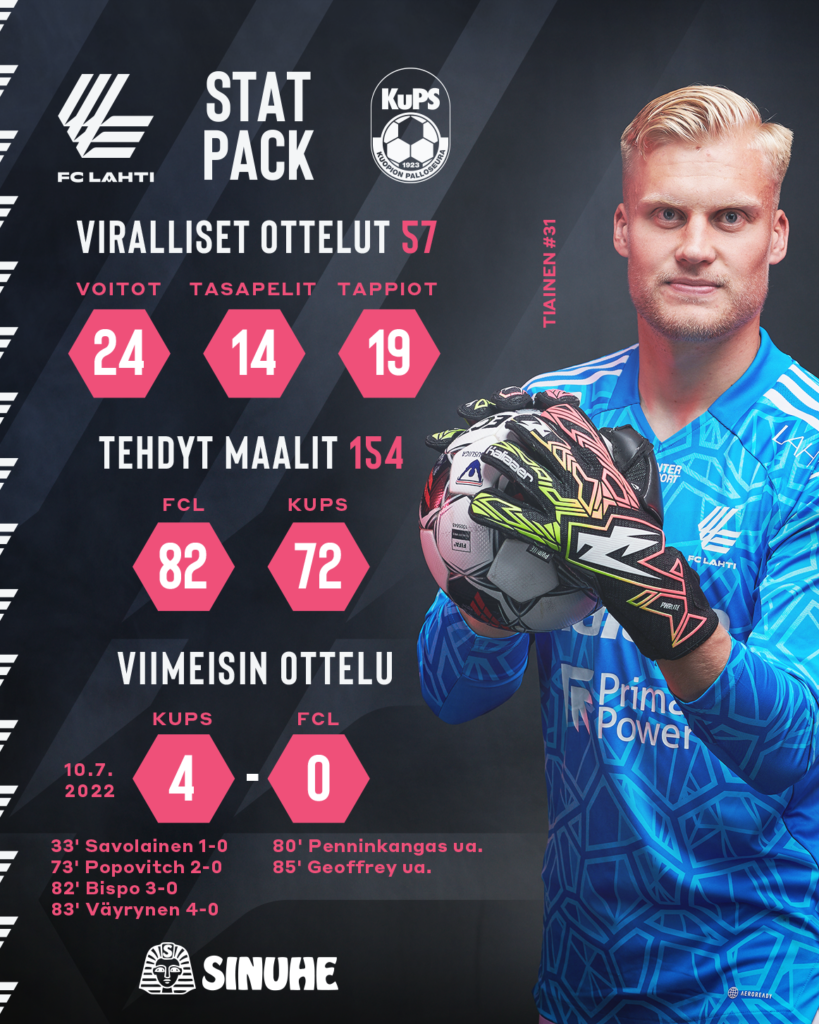 #2 Putki: FC Lahti on pelannut kymmenen viimeistä KuPS-ottelua ilman voittoa. Edellinen voitto on kaudelta 2018, jolloin Santeri Hostikka upotti lisäajalla pilkun kuopiolaisten verkkoon. Rangaistuspotku oli tuomittu Henri Toivomäen käsivirheestä. KuPS on myös voittanut kaikki neljä keskinäistä kohtaamista Suomen Cupissa. Kaksi kohtaamisista on ollut lohkovaiheessa ja kaksi pudotuspelivaiheessa. Rafael on osunut molemmissa pudotuspelivaiheen otteluissa.