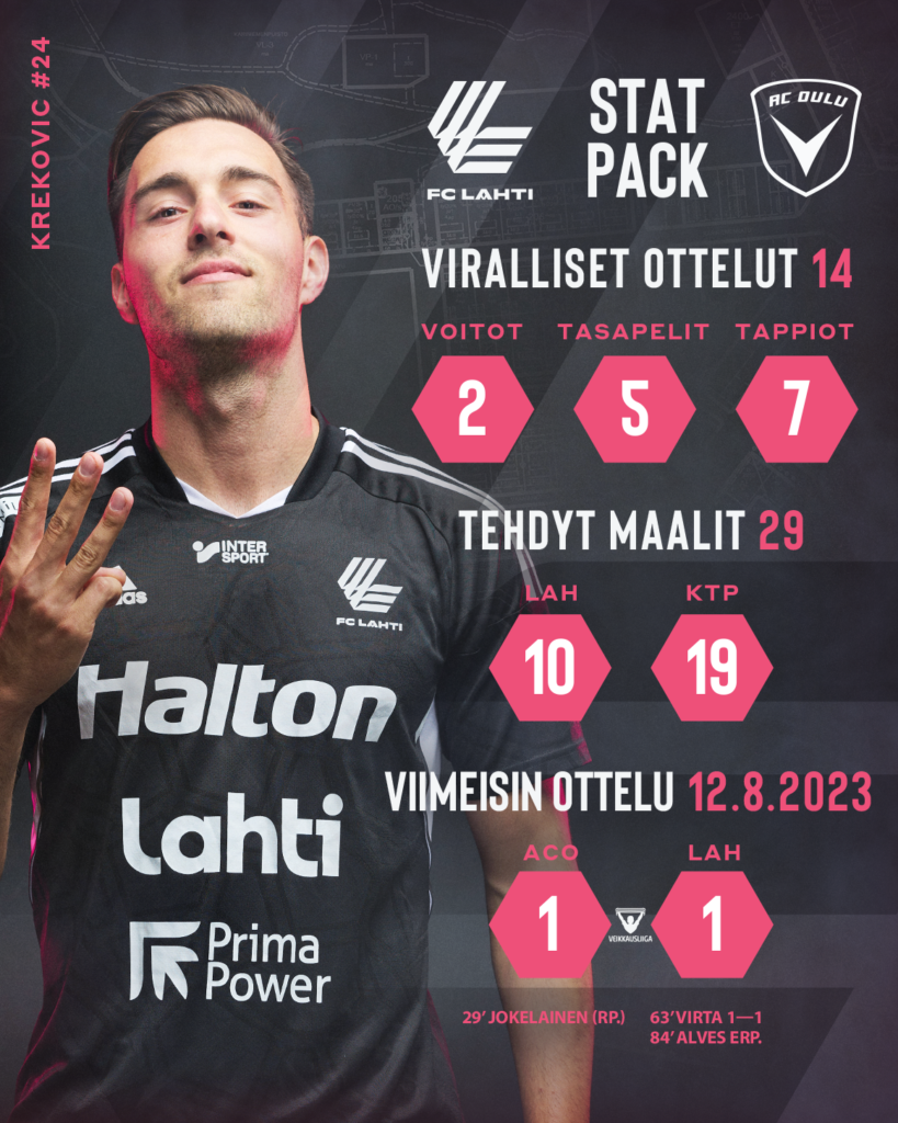 FC Lahti ja AC Oulu ovat kohdanneet toisensa virallisissa otteluissa 14 kertaa. Lahti on onnistunut voittamaan kohtaamisista vain kaksi ja oululaiset ovat juhlineet voittoa seitsemän kertaa. Tästä johtuen AC Oulu on edellä myös maaleissa. Lahti on viimeistellyt kohtaamisissa kymmenen täysosumaa, oululaiset 19. Lahti on jäänyt ilman voittoa myös tämän kauden kahdessa edellisessä ottelussa. Lahdessa Oulu nappasi 2—1-voiton Onni Hännisen vietyä Lahden johtoon. Toisella jaksolla Ashley Coffey tasoitti ja päätöslukemat iski rangaistuspotkusta Rasmus Karjalainen. Myös Oulussa pelatussa ottelussa AC Oulu iski pilkulta. Eemeli Virta tasoitti ottelun ja Lahti sai lopussa mahdollisuutensa kauan kaivattuun voittoon. Matheus Alvesin rangaistuspotku ei uponnut ja pisteet tasattiin 1—1.