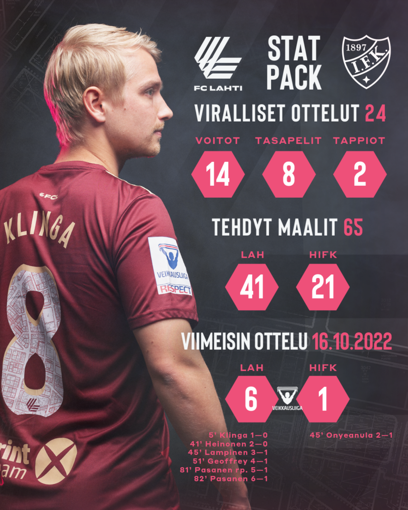 #2 Putki: Viisi edellistä keskinäistä kohtaamista ovat olleet lahtelaisille tappiottomia. IFK:n edellinen voitto Lahdesta on ollut Suomen Cupin lohkovaiheessa kaudella 2021, jolloin helsinkiläiset onnistuivat voittamaan lukemin 1—0. Ottelun ainokaisen iski aivan lopussa juuri kentälle tullut Jeremiah Streng.