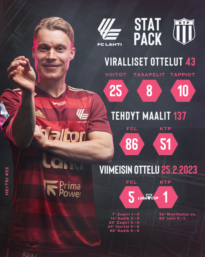 FC Lahti ja KTP:n kaikki nimivariaatiot ovat kohdanneet toisensa virallisissa otteluissa vuodesta 1997 asti yhteensä 43 kertaa. Lahti on vienyt nimiinsä 25 ottelua ja hävinnyt vain kymmenesti. Lahtelaiset lähestyvät myös sadan maalin rajapyykkiä, sillä KTP:tä on kuritettu jo 86 kertaa. Kotkalaiset ovat puolestaan osuneet 51 kertaa. Talven Liigacupissa Lahti ratkaisi pelin 20 minuutissa ja takoi lopulta komeat 5—1-lukemat taululle Mukkulan kuplassa. Altin Zeqiri ja Irfan Sadik osuivat kahdesti.