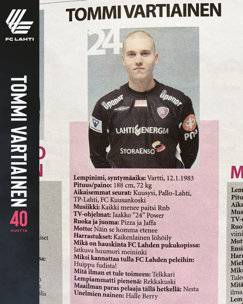 FC Lahden entinen pelaaja ja nykyinen Lahden Reippaan valmentaja Tommi Vartiainen täyttää tänään komeat 40 vuotta. Puolustajana pelannut Vartiainen teki ikimuistoisen debyyttinsä kaudella 2005 FF Jaroa vastaan ja iski heti ensimmäisessä liigaottelussaan kaksi osumaa ja oli lähellä kolmatta. Vartiainen pelasi urallaan myös FC KooTeePeessä ja yhteensä hänellä on 22 liigaottelua. Valmentajaurallaan hän on valmentanut FC Lahden A-nuoret Suomen mestaruuteen kaudella 2018.
