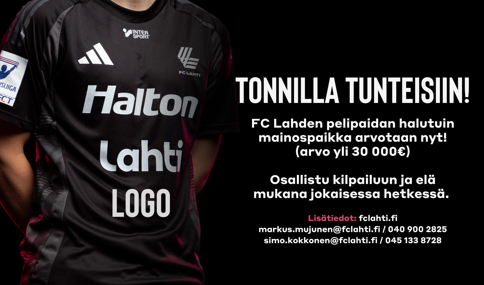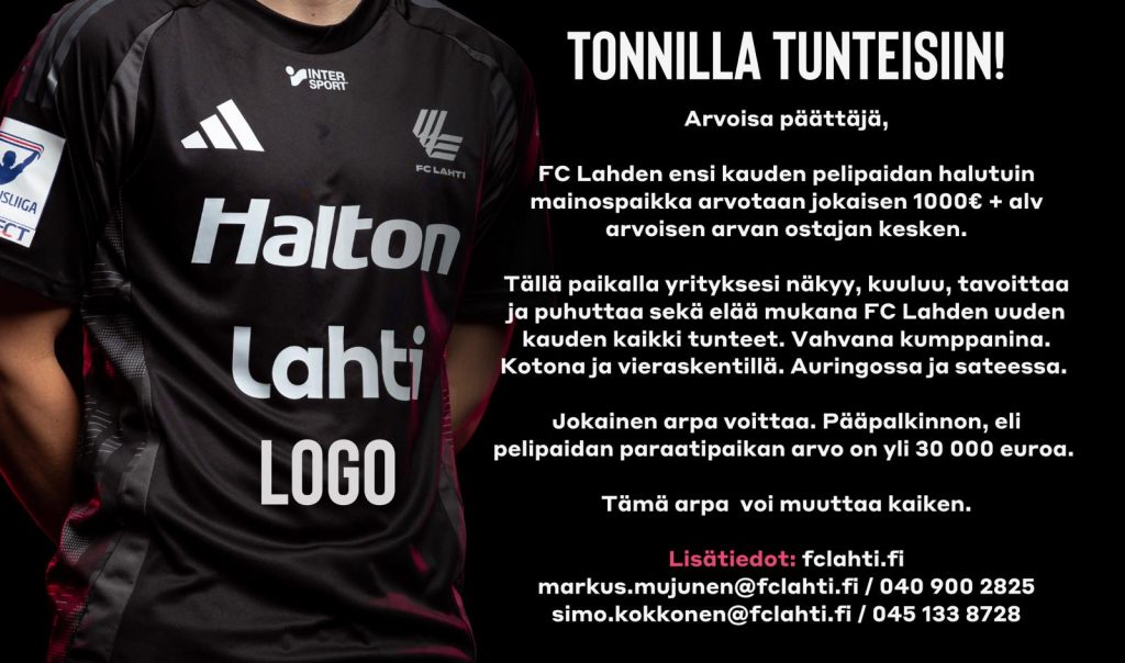 FC Lahden ensi kauden pelipaidan halutuin mainospaikka arvotaan jokaisen tuhannen (1000) euron (+ alv 25,5%) arvan ostaneen kesken. Tällä paikalla yrityksesi näkyy, kuuluu, tavoittaa ja puhuttaa, sekä elää mukana kaikki FC Lahden uuden kauden tunteet vahvana kumppanina kotona ja vieraskentällä, auringossa ja sateessa.