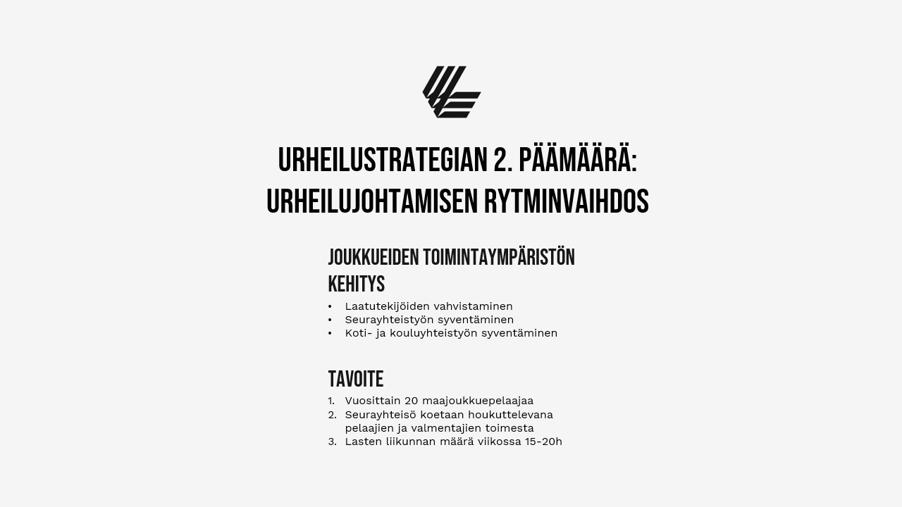 Viime viikolla kuvasimme uuden urheilustrategian taustaa ja sen ensimmäistä päämäärää ”Pelaajamäärien merkittävää lisäämistä”. Nyt jatkamme esittelemällä toisen, urheilustrategian ytimessä olevan päämäärän, ”Urheilujohtamisen rytminvaihdoksen”. Tässä taustoitamme lyhyesti valinnan taustaa, sille asetettuja tulostavoitteita ja keskeisiä keinoja.