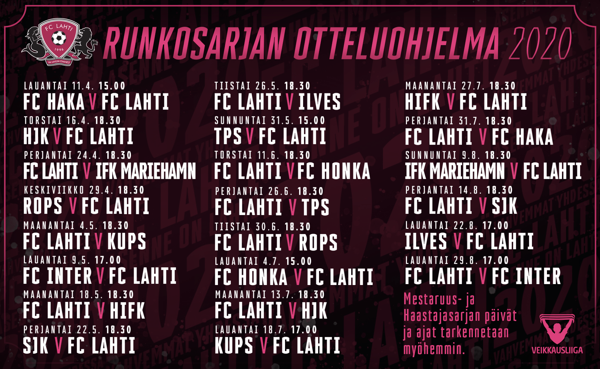 Veikkausliigan mestari on selvillä viimeistään 17.10. ja eurolopputurnauksen finaalit pelataan alustavasti 28.10. ja 1.11. Koko ligan otteluohjelmaan pääset tutustumaan tästä → http://www.veikkausliiga.com/uutiset/2020/01/15/veikkausliigan-otteluohjelma-2020-julkaistu