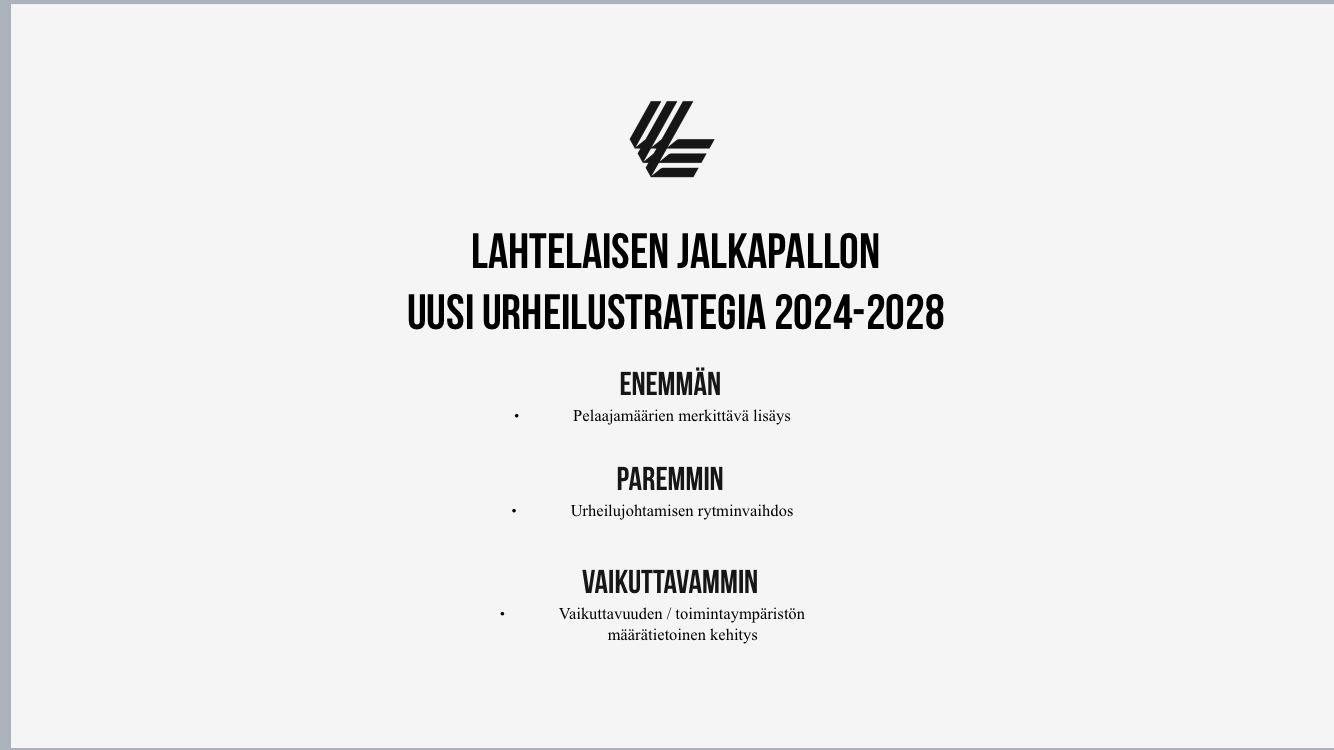 Työskentelyn aikana on rakennettu lahtelaisen jalkapallon uusi urheilustrategia, joka pohjaa FC Lahden strategian kivijalkoihin. Laadukas huippu-urheilutoiminta, Päijät-Hämeen merkityksellisin seurayhteisö sekä kestävä ja kasvava talous ovat jatkossakin seurayhteisölle tärkeät painopistealueet.