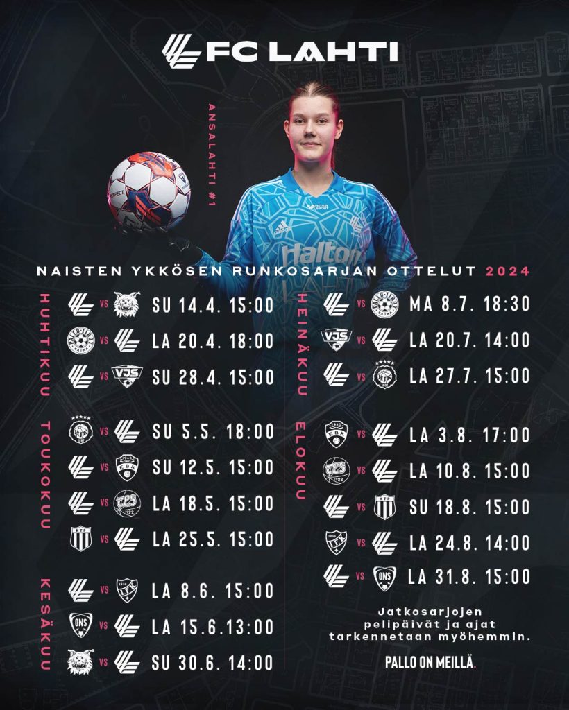 Ykkösen runkosarjan otteluohjelma on julkaistu. FC Lahden naisten edustusjoukkue aloittaa sarjaurakkansa kotiottelulla Ilveksen kakkosjoukkuetta vastaan. Ottelu pelataan sunnuntaina 14.4. kello 15.00 alkaen Kisapuistossa.