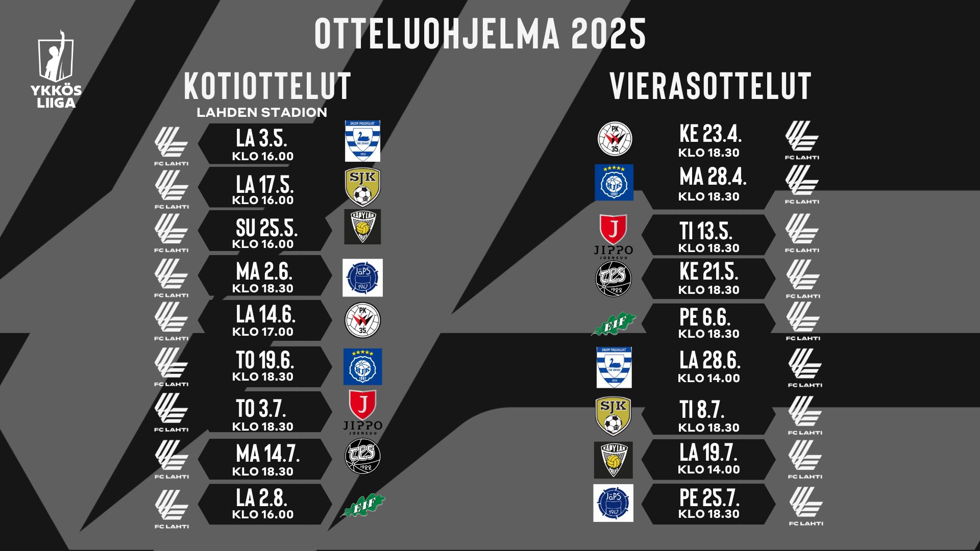 FC Lahti aloittaa kauden 2025 kahdella vierasottelulla PK-35:n ja HJK Klubi 04:n vieraana. Ensimmäinen kotiottelu Lahden stadionilla pelataan kierroksella 3, kun lauantaina 3.5. kello 16.00 vieraaksi saapuu Salon Palloilijat.